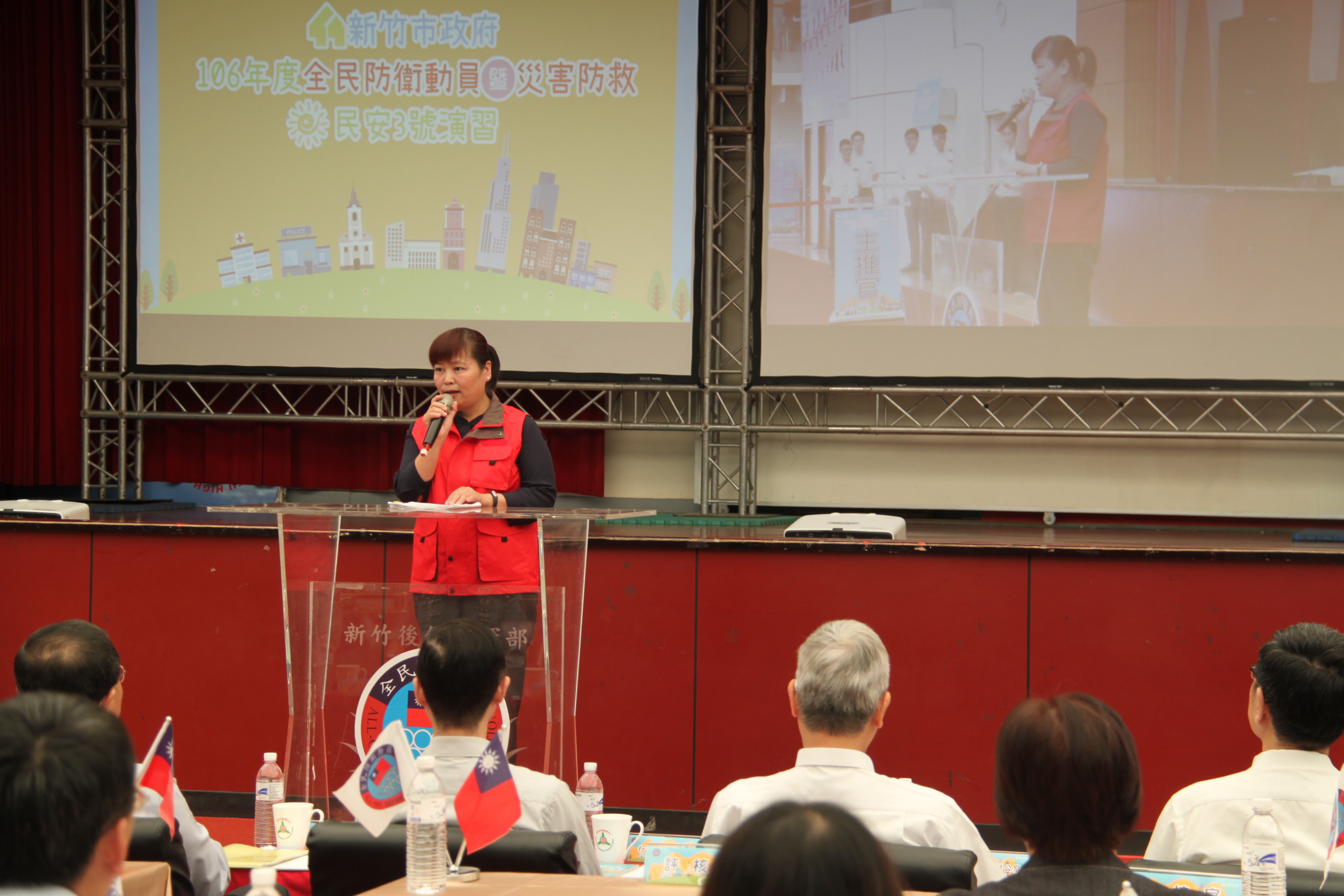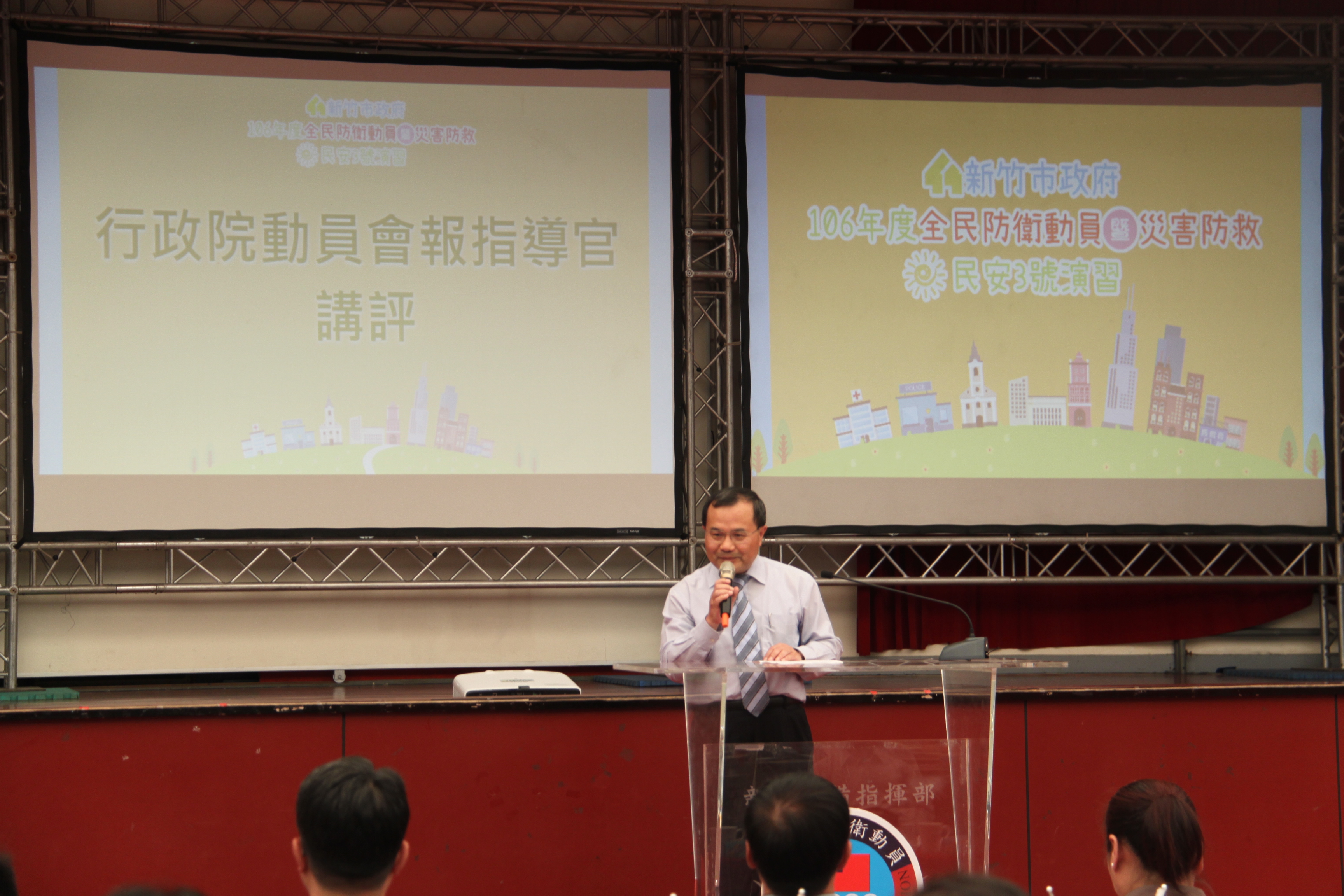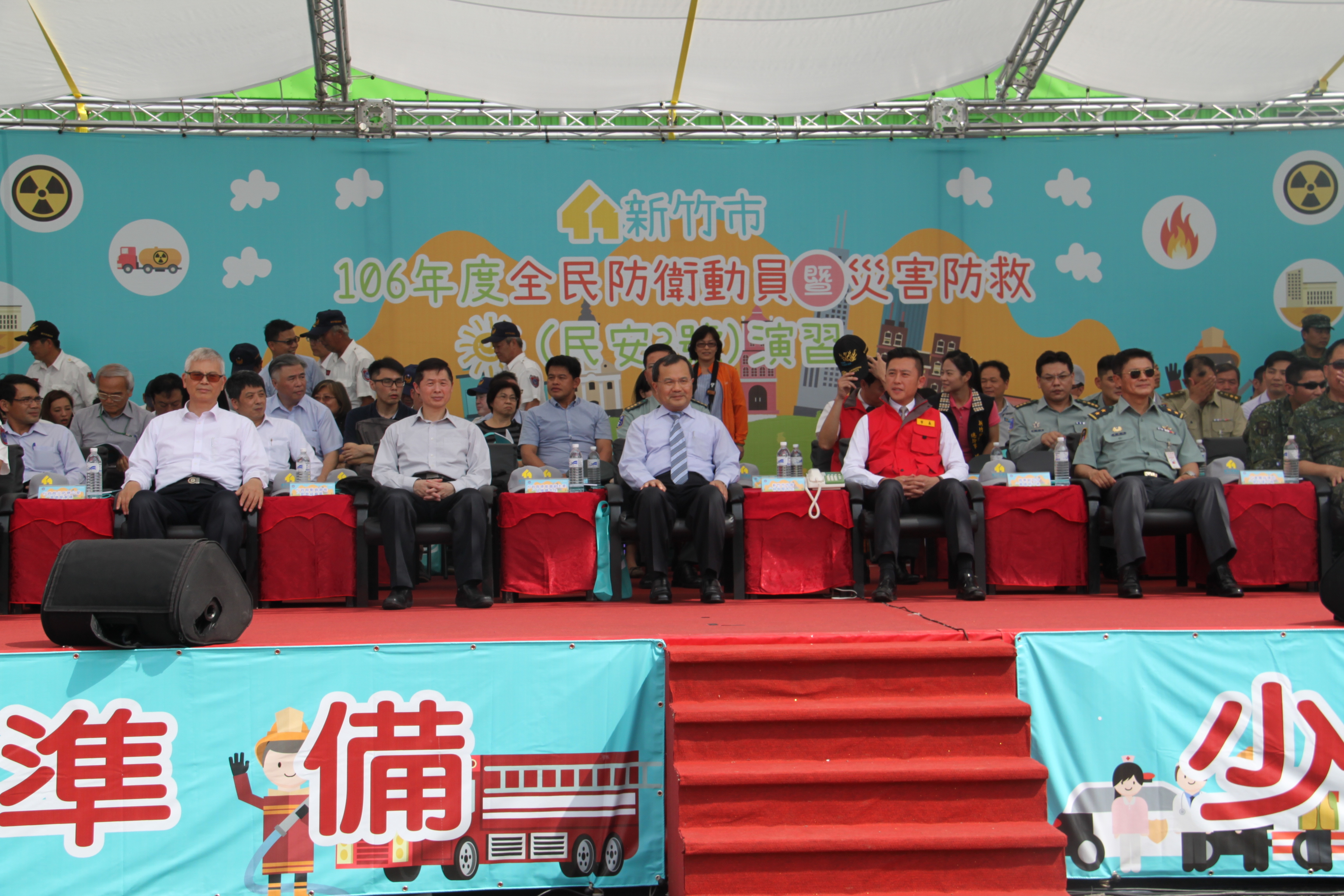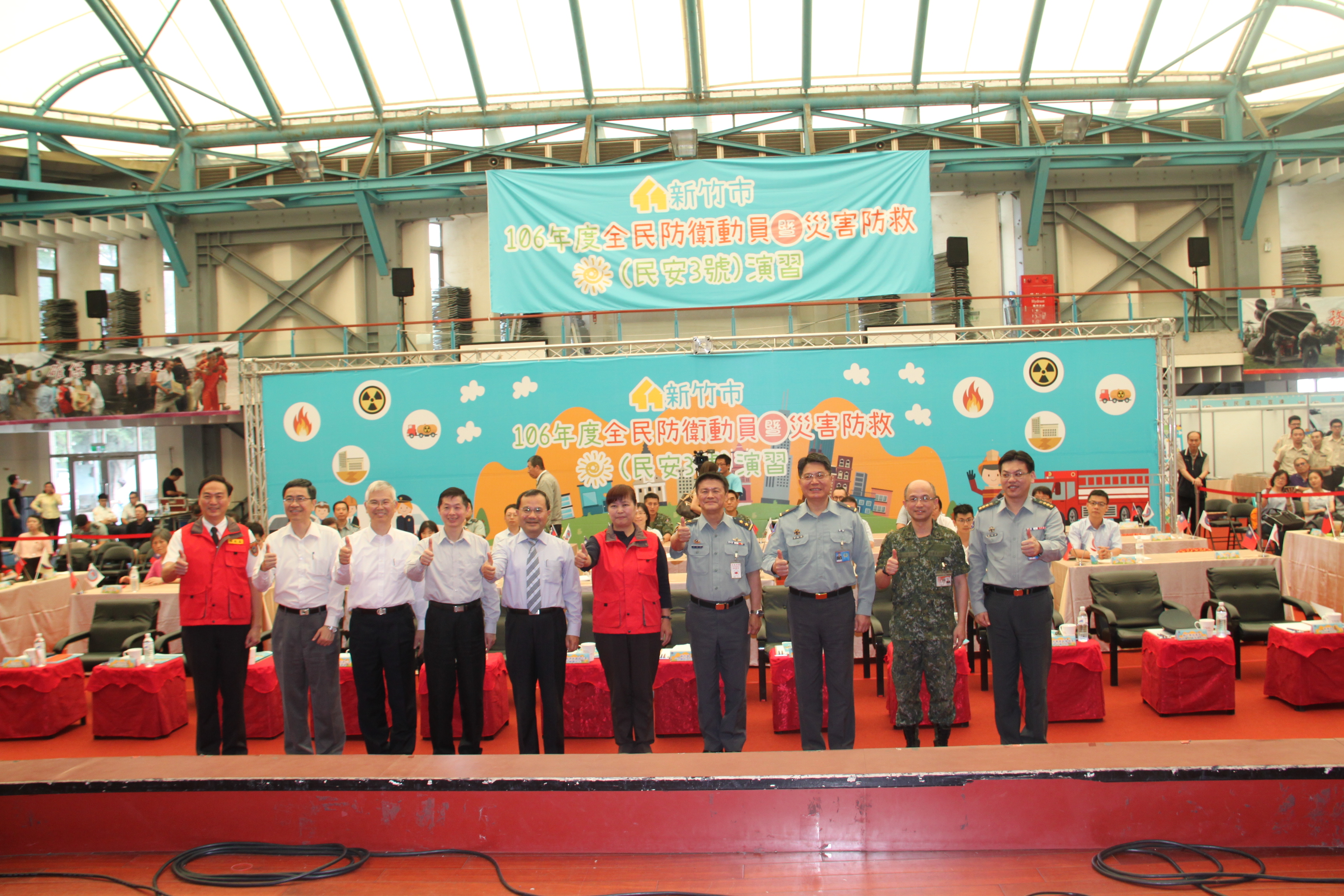 106年全民防衛動員暨災害防救(民安3號)演習-新竹市場次於5月18日(星期四)0930時至1600時,上午兵棋推演由副市長沈慧虹女士主持,下午綜合實作演練由市長林智堅先生主持,假光復中學體育館及新竹大潤發停車場辦理完畢。演練內容針對新竹市因地震引發複合式災害,如「放射性物質意外事件疏散及檢測演練」及「建築物倒塌人命搜救」之應變處置,實施兵棋推演及實作演練。演習指導官由原能會副主委邱賜聰先生擔任,並率領各部會代表出席視導,參演人員演練動作確實,各項應變處置得宜,充分展現政、軍、民間之協調合作能力,有效提高轄內各單位防災應變處置能力。