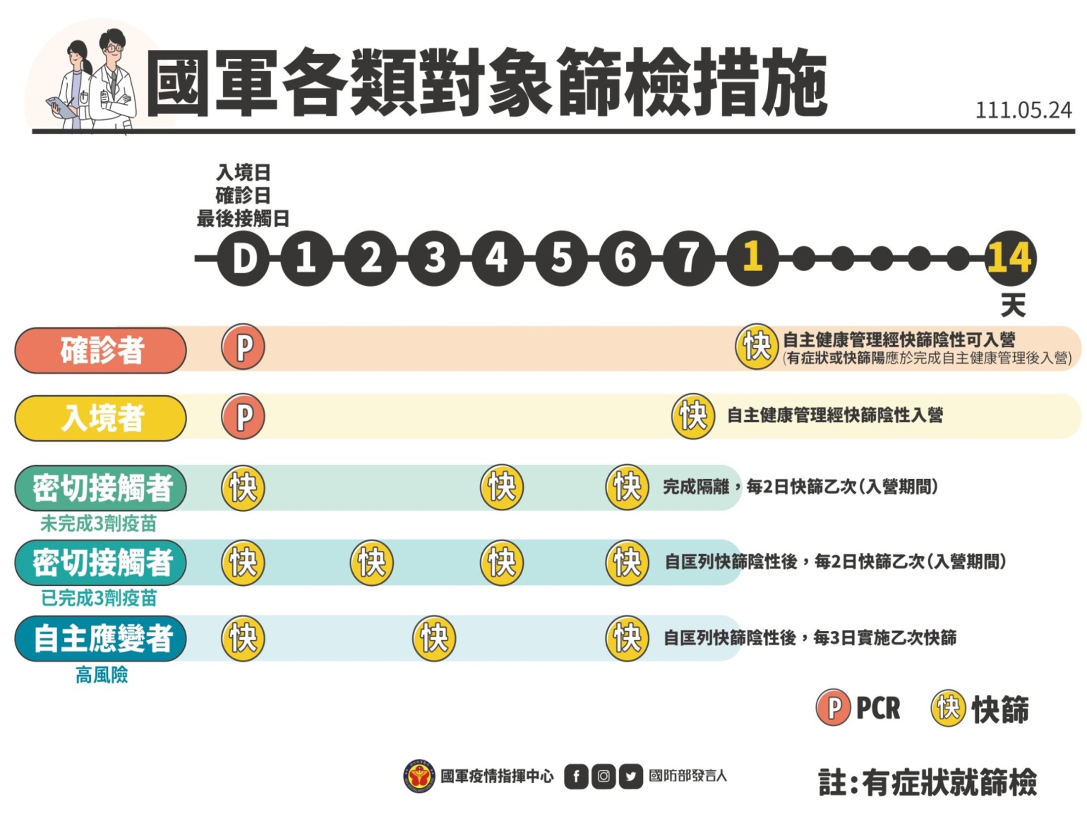 2、若官兵確診,即啟動「重點疫調、就地隔離、快速篩檢、立即照護」等應變措施。