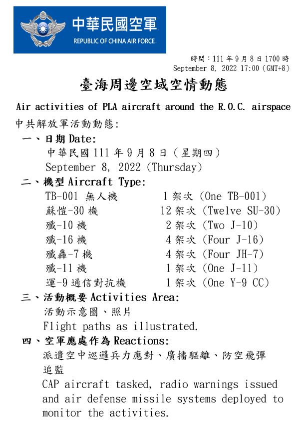 國防部今(8)日表示,迄1700時止,偵獲共機45架次(逾越海峽中線及其延伸線進入西南空域25架次)、共艦7艘次,持續於臺灣周邊海空域活動。國軍運用任務機、艦及岸置飛彈系統嚴密監控與應處。