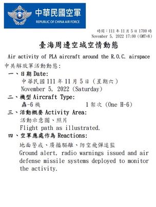 國防部今(5)日表示,迄1700時止,偵獲共機9架次(進入西南空域1架次)、共艦2艘次,持續於臺灣周邊海空域活動。國軍運用任務機、艦及岸置飛彈系統嚴密監控與應處。