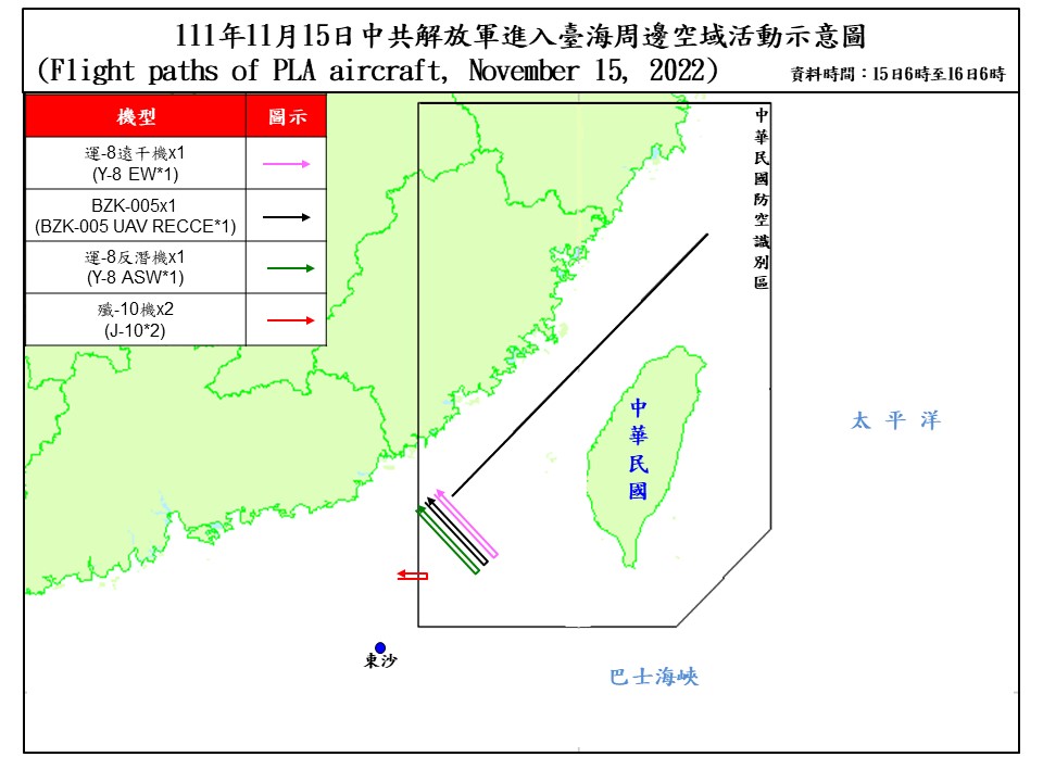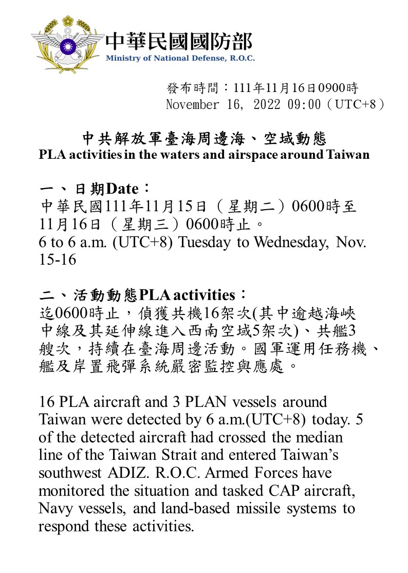 迄0600時止,偵獲共機16架次(其中逾越海峽中線及其延伸線進入西南空域5架次)、共艦3艘次,持續在臺海周邊活動。國軍運用任務機、艦及岸置飛彈系統嚴密監控與應處。