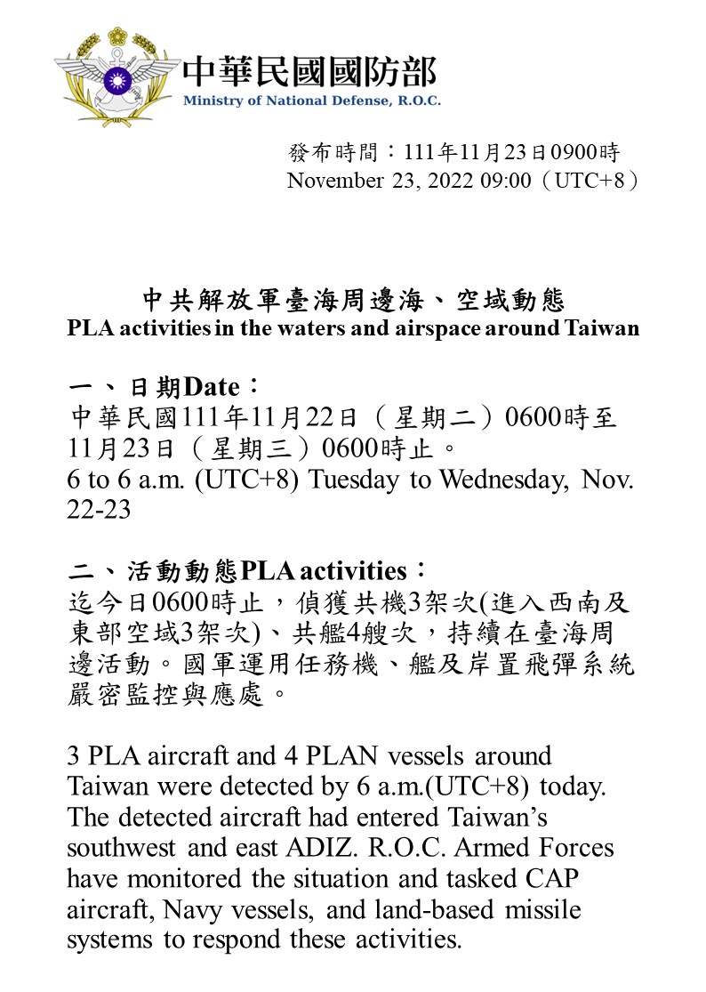 迄今日0600時止,偵獲共機3架次(進入西南及東部空域3架次)、共艦4艘次,持續在臺海周邊活動。國軍運用任務機、艦及岸置飛彈系統嚴密監控與應處。