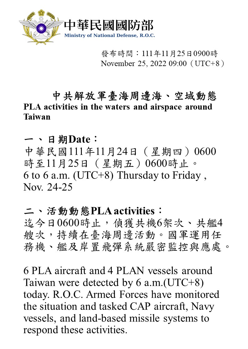 迄今日0600時止,偵獲共機6架次、共艦4艘次,持續在臺海周邊活動。國軍運用任務機、艦及岸置飛彈系統嚴密監控與應處。