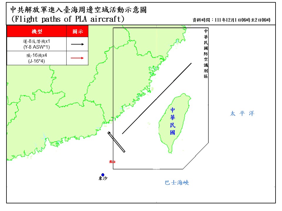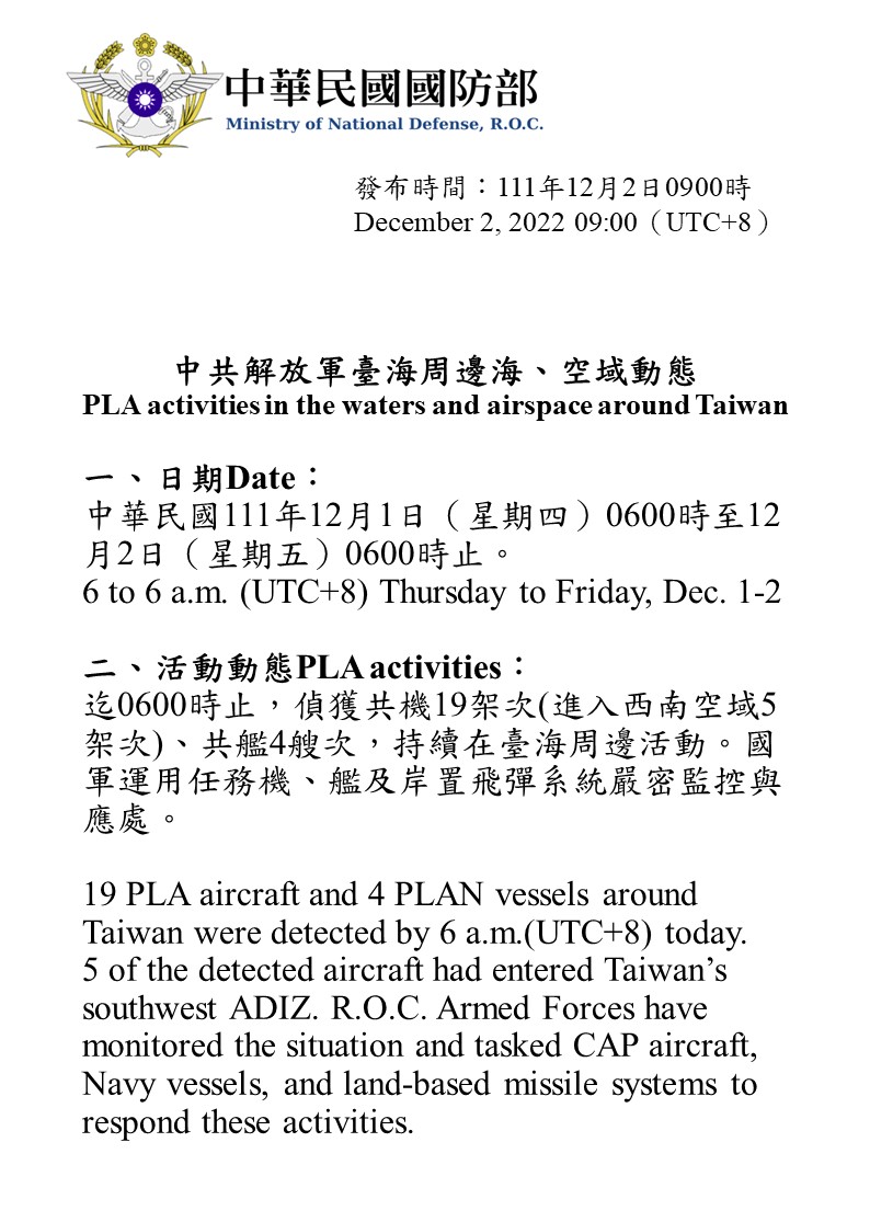 迄今日0600時止,偵獲共機19架次(其中進入西南空域5架次)、共艦4艘次,持續在臺海周邊活動。國軍運用任務機、艦及岸置飛彈系統嚴密監控與應處。