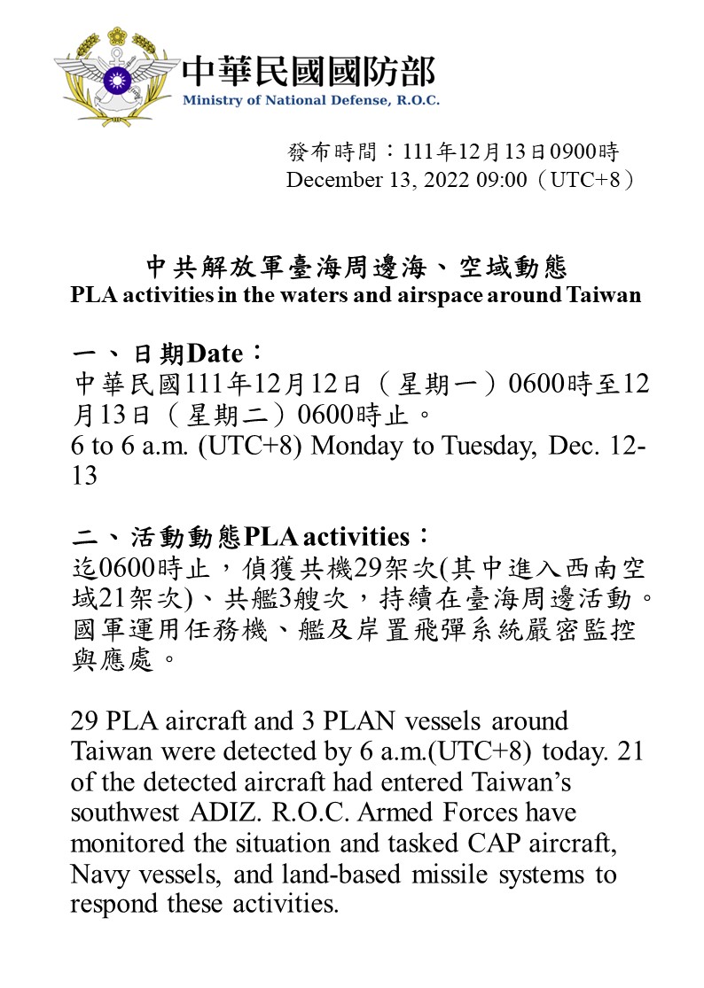 迄0600時止,偵獲共機29架次(其中進入西南空域21架次)、共艦3艘次,持續在臺海周邊活動。國軍運用任務機、艦及岸置飛彈系統嚴密監控與應處。