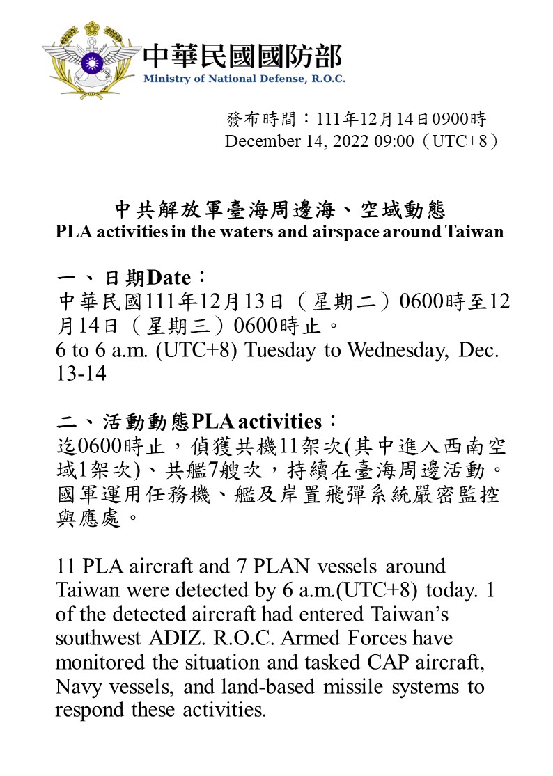 迄0600時止,偵獲共機11架次(其中進入西南空域1架次)、共艦7艘次,持續在臺海周邊活動。國軍運用任務機、艦及岸置飛彈系統嚴密監控與應處。