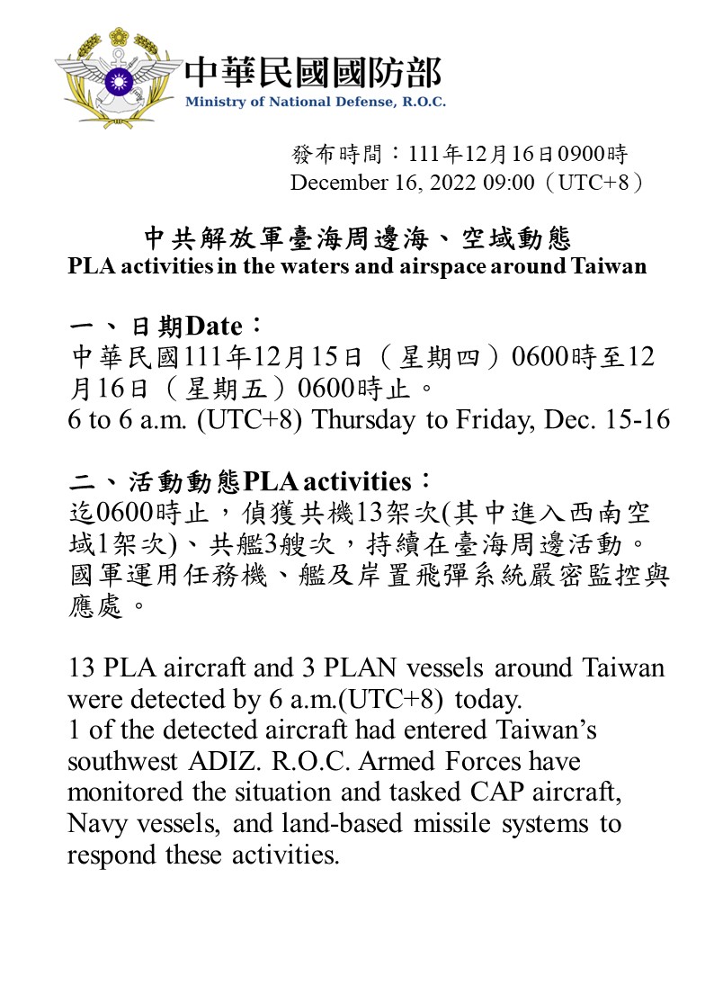 迄0600時止,偵獲共機13架次(其中進入西南空域1架次)、共艦3艘次,持續在臺海周邊活動。國軍運用任務機、艦及岸置飛彈系統嚴密監控與應處。
