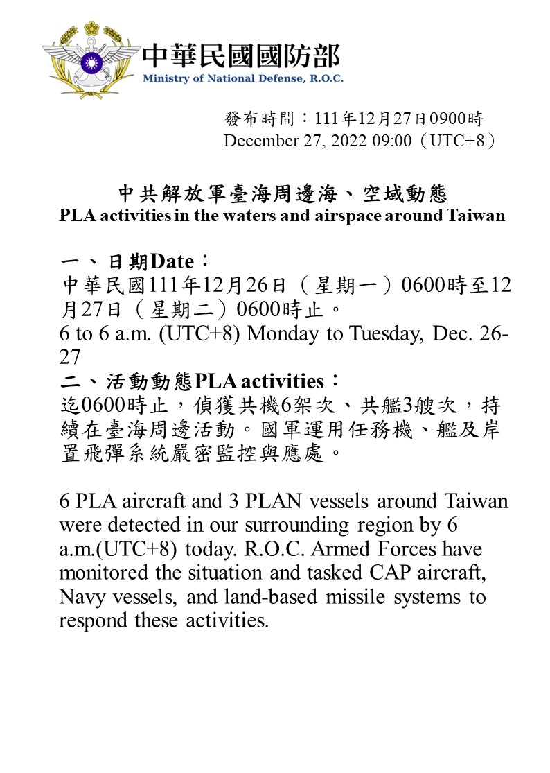迄0600時止,偵獲共機6架次、共艦3艘次,持續在臺海周邊活動。國軍運用任務機、艦及岸置飛彈系統嚴密監控與應處。