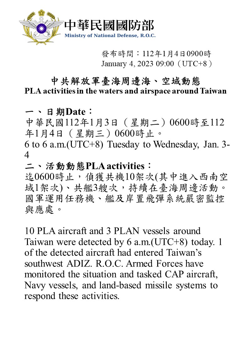 迄0600時止,偵獲共機10架次(其中進入西南空域1架次)、共艦3艘次,持續在臺海周邊活動。國軍運用任務機、艦及岸置飛彈系統嚴密監控與應處。