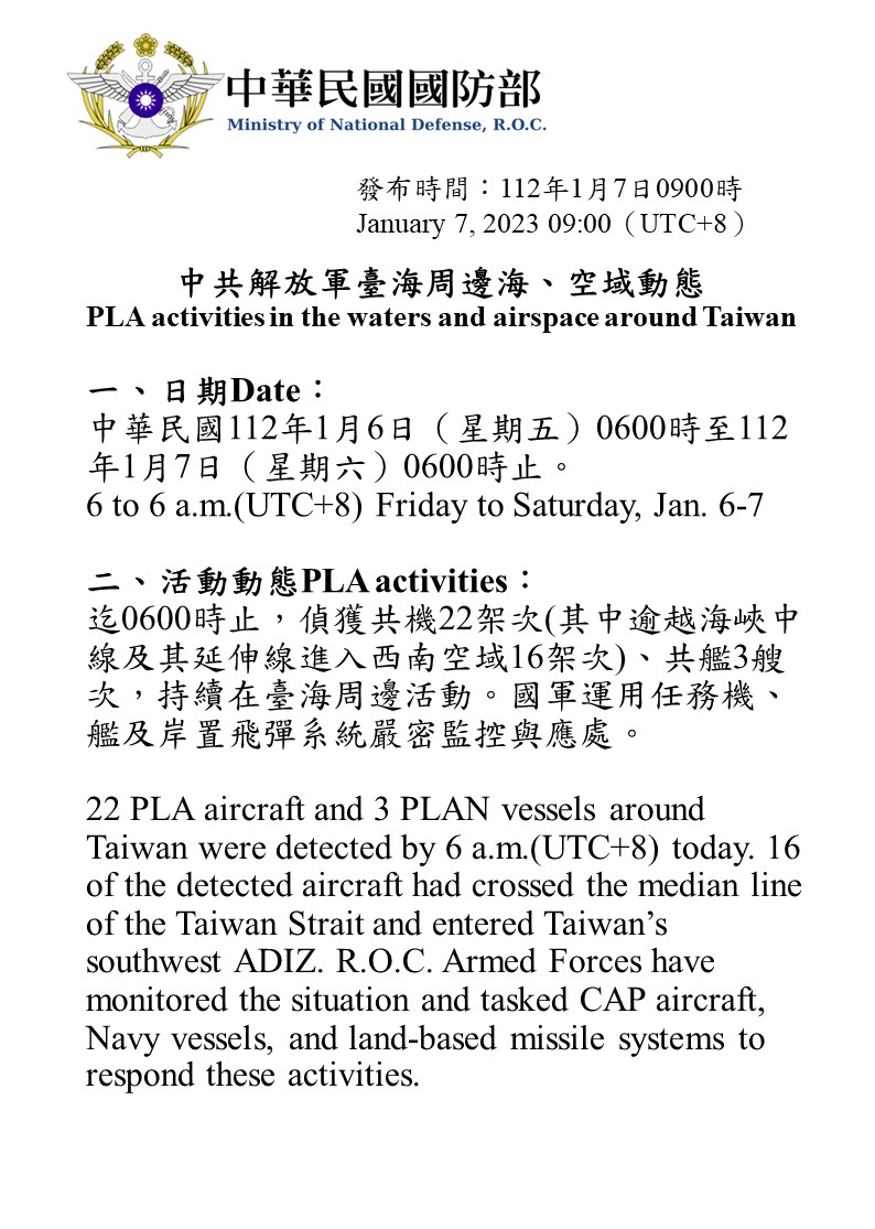 迄0600時止,偵獲共機22架次(其中逾越海峽中線及其延伸線進入西南空域16架次)、共艦3艘次,持續在臺海周邊活動。國軍運用任務機、艦及岸置飛彈系統嚴密監控與應處。