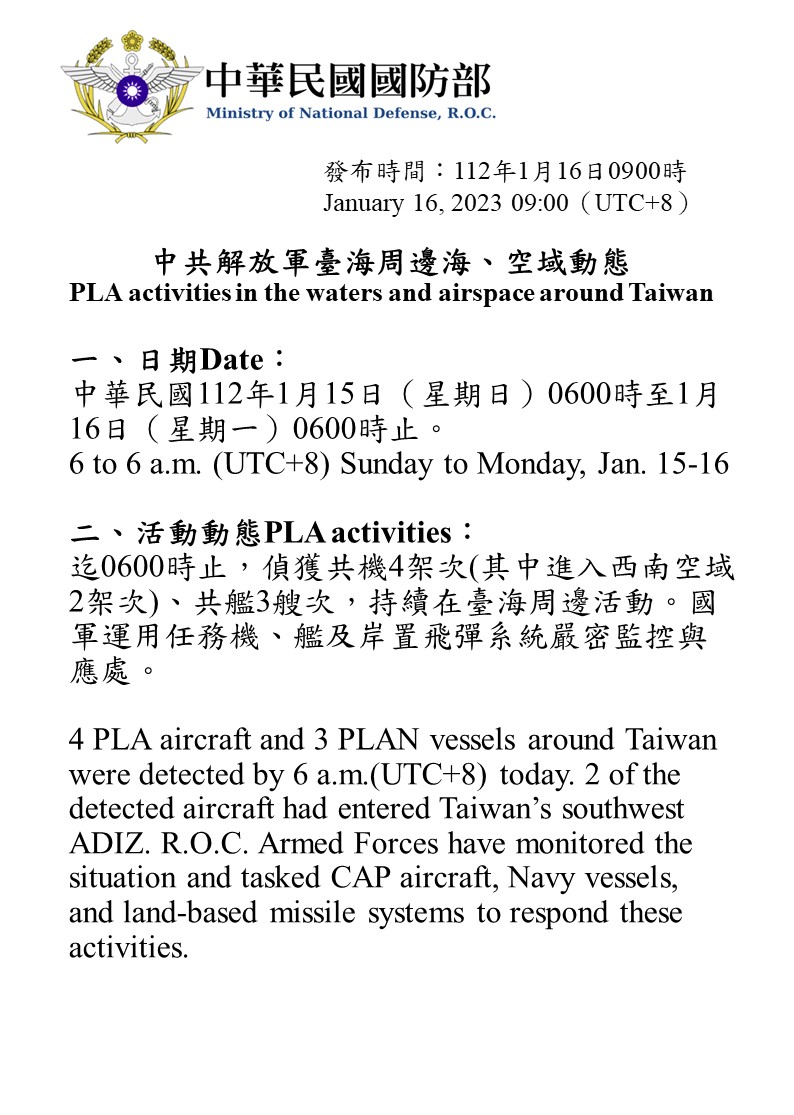 迄0600時止,偵獲共機4架次(其中進入西南空域2架次)、共艦3艘次,持續在臺海周邊活動。國軍運用任務機、艦及岸置飛彈系統嚴密監控與應處。