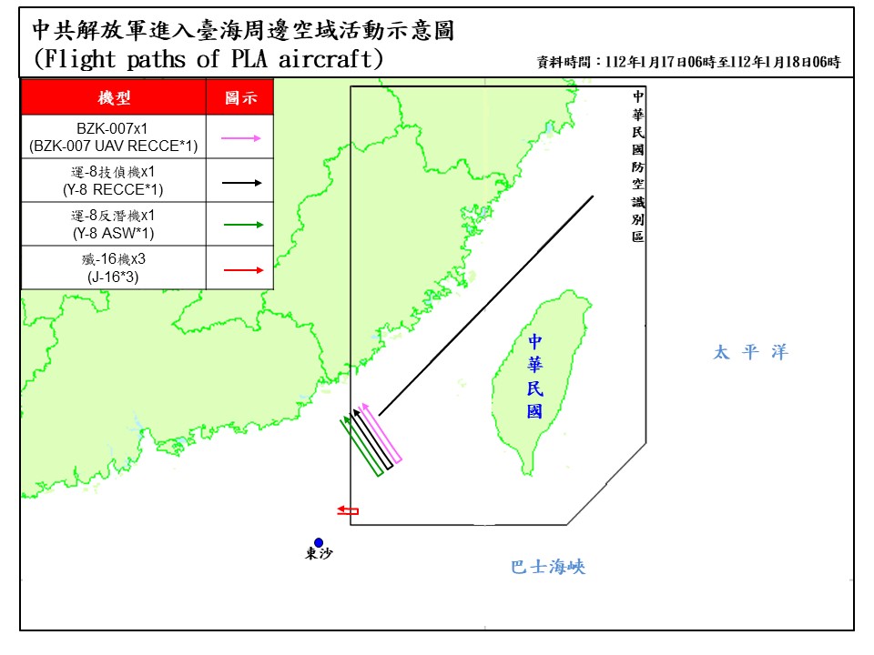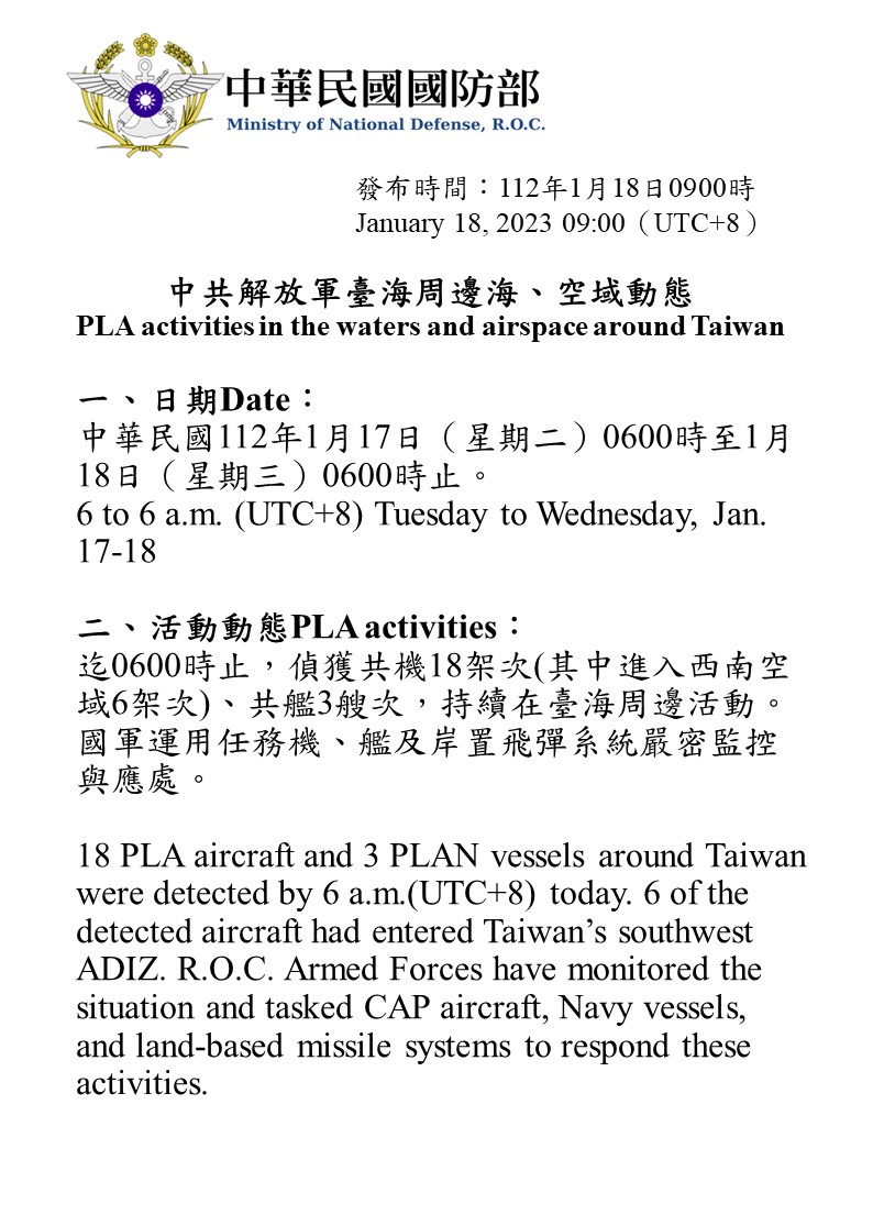 迄0600時止,偵獲共機18架次(其中進入西南空域6架次)、共艦3艘次,持續在臺海周邊活動。國軍運用任務機、艦及岸置飛彈系統嚴密監控與應處。