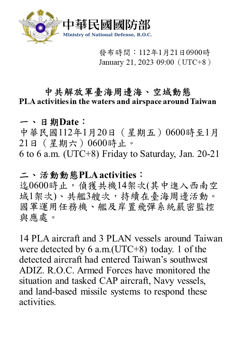 迄0600時止,偵獲共機14架次(其中進入西南空域1架次)、共艦3艘次,持續在臺海周邊活動。國軍運用任務機、艦及岸置飛彈系統嚴密監控與應處。