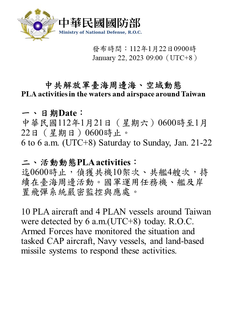 迄0600時止,偵獲共機10架次、共艦4艘次,持續在臺海周邊活動。國軍運用任務機、艦及岸置飛彈系統嚴密監控與應處。
