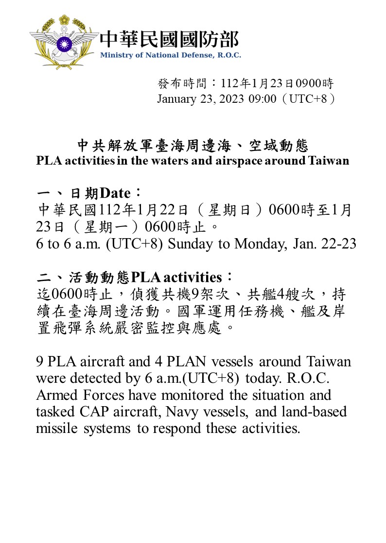 迄0600時止,偵獲共機9架次、共艦4艘次,持續在臺海周邊活動。國軍運用任務機、艦及岸置飛彈系統嚴密監控與應處。
