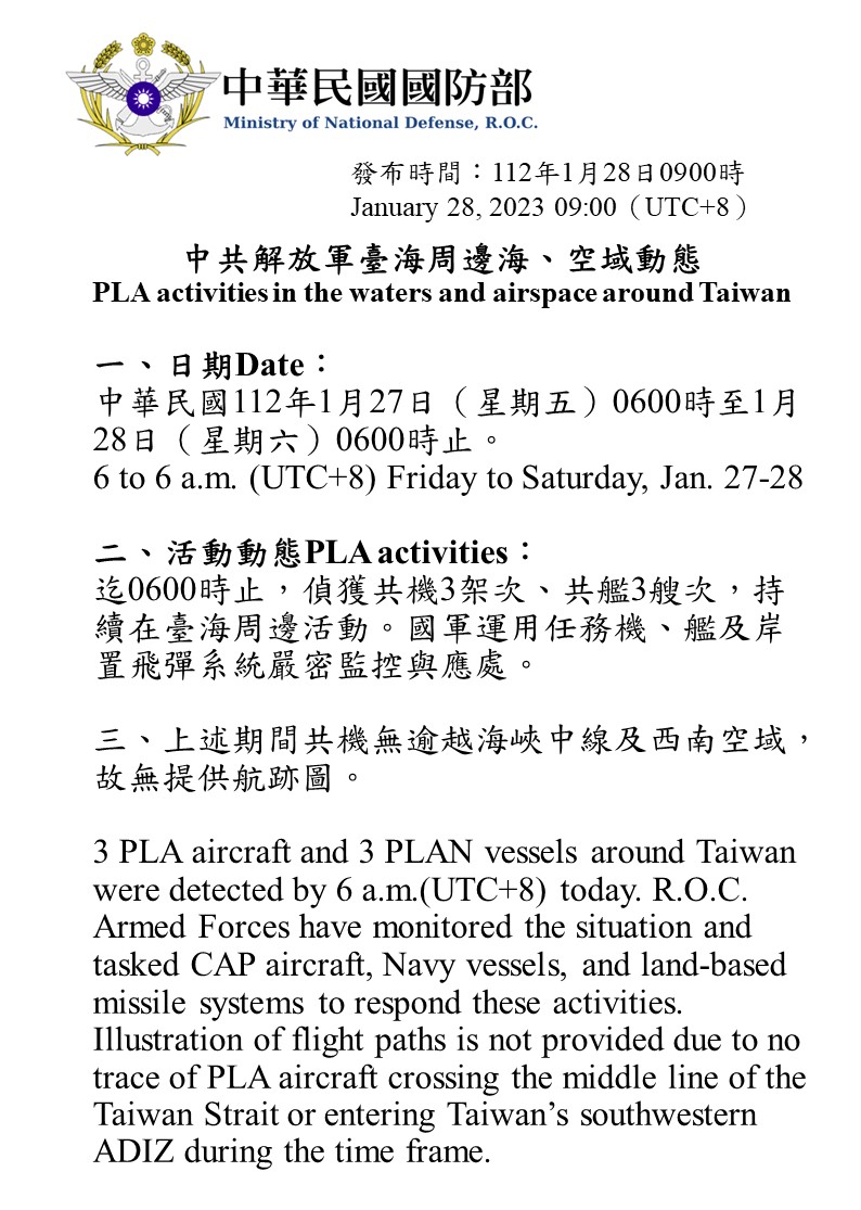 迄0600時止,偵獲共機3架次、共艦3艘次,持續在臺海周邊活動。國軍運用任務機、艦及岸置飛彈系統嚴密監控與應處。