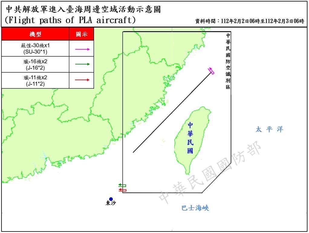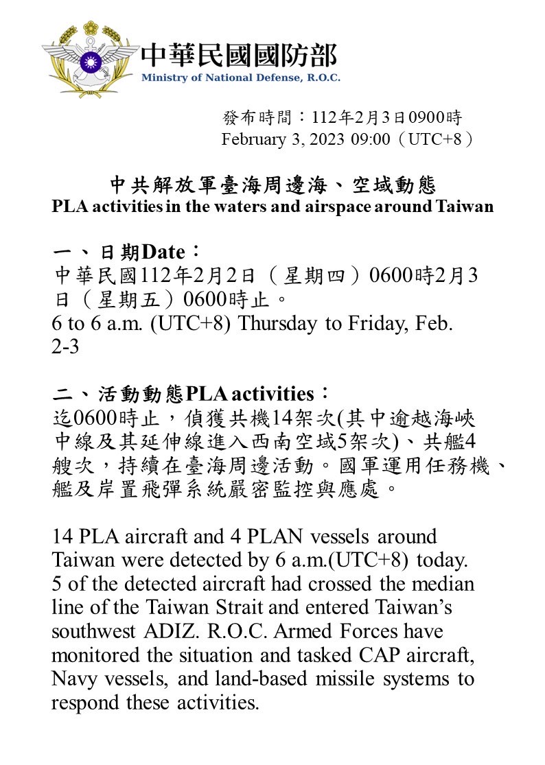 迄0600時止,偵獲共機14架次(其中逾越海峽中線及其延伸線進入西南空域5架次)、共艦4艘次,持續在臺海周邊活動。國軍運用任務機、艦及岸置飛彈系統嚴密監控與應處。