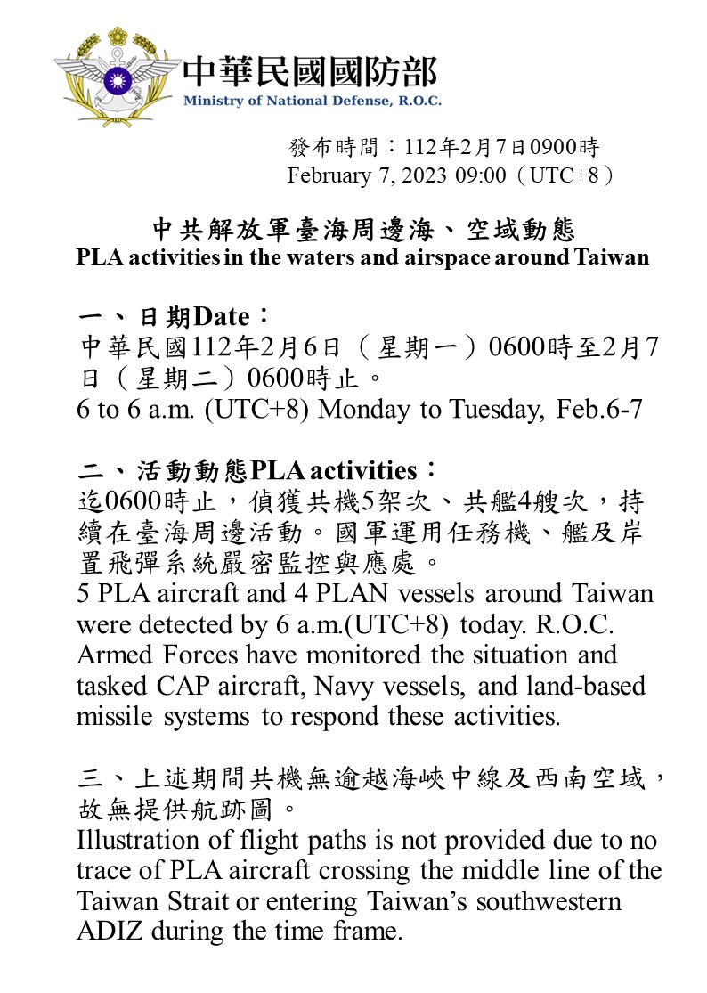 迄0600時止,偵獲共機5架次、共艦4艘次,持續在臺海周邊活動。國軍運用任務機、艦及岸置飛彈系統嚴密監控與應處。