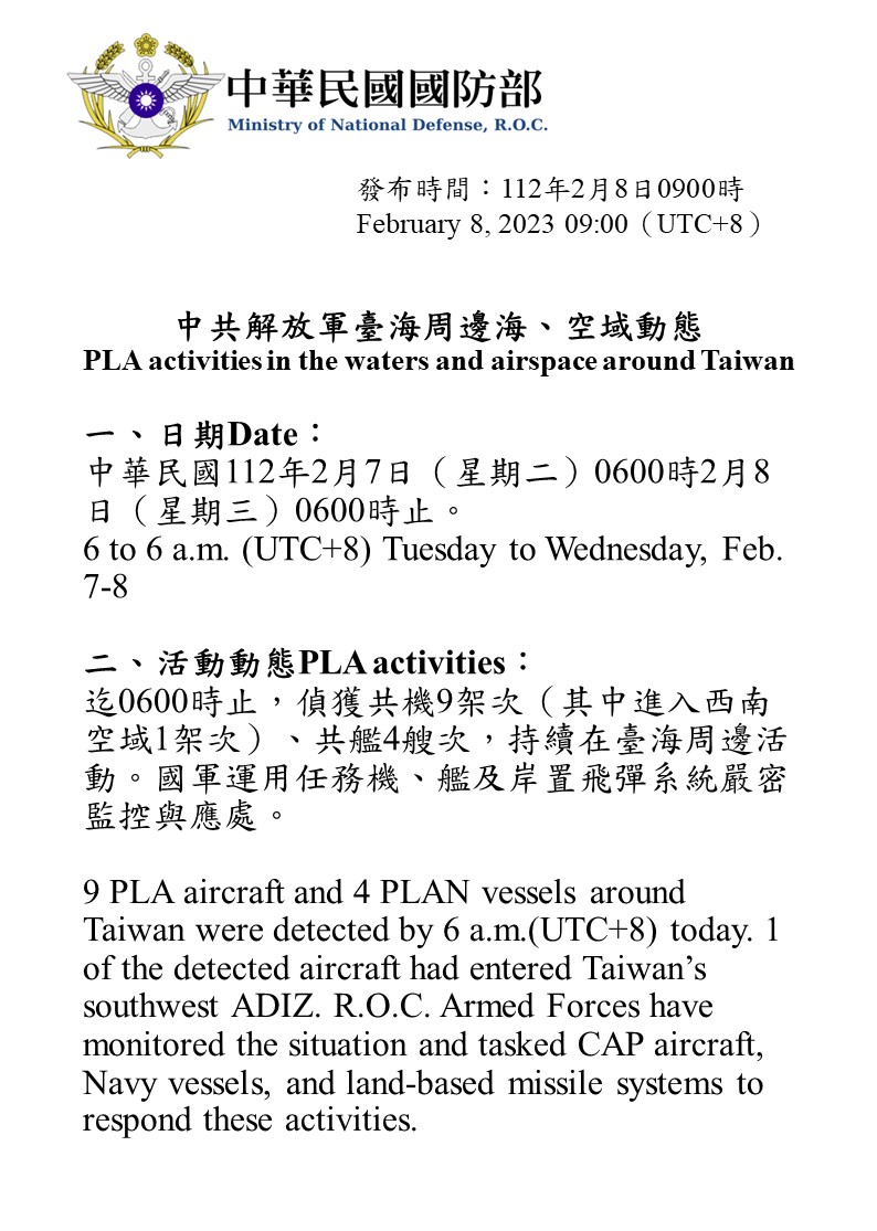 迄0600時止,偵獲共機9架次(其中進入西南空域1架次)、共艦4艘次,持續在臺海周邊活動。國軍運用任務機、艦及岸置飛彈系統嚴密監控與應處。