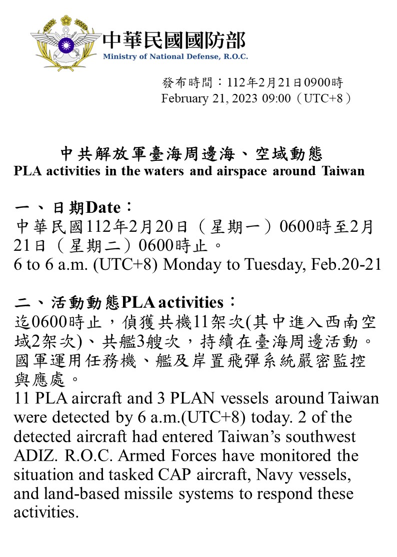 迄0600時止,偵獲共機11架次(其中進入西南空域2架次)、共艦3艘次,持續在臺海周邊活動。國軍運用任務機、艦及岸置飛彈系統嚴密監控與應處。