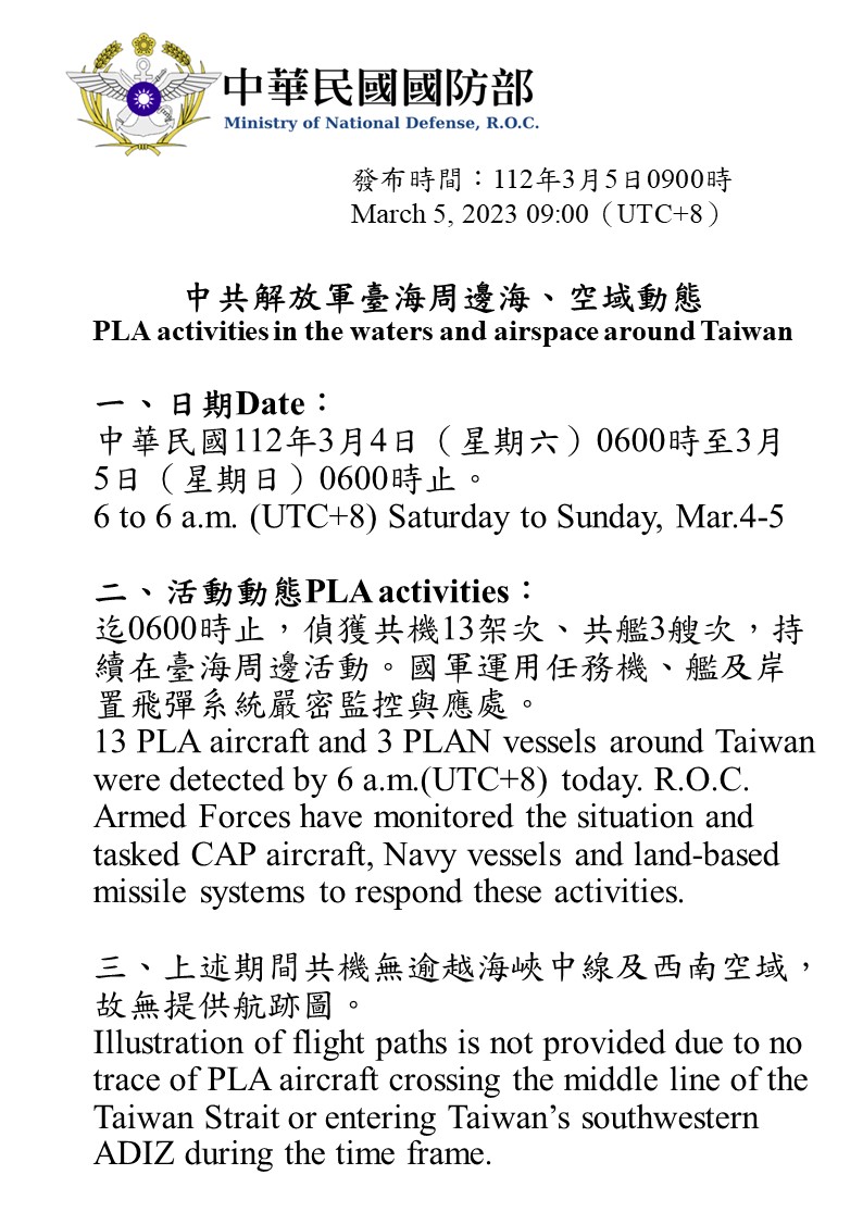 迄0600時止,偵獲共機13架次、共艦3艘次,持續在臺海周邊活動。國軍運用任務機、艦及岸置飛彈系統嚴密監控與應處。