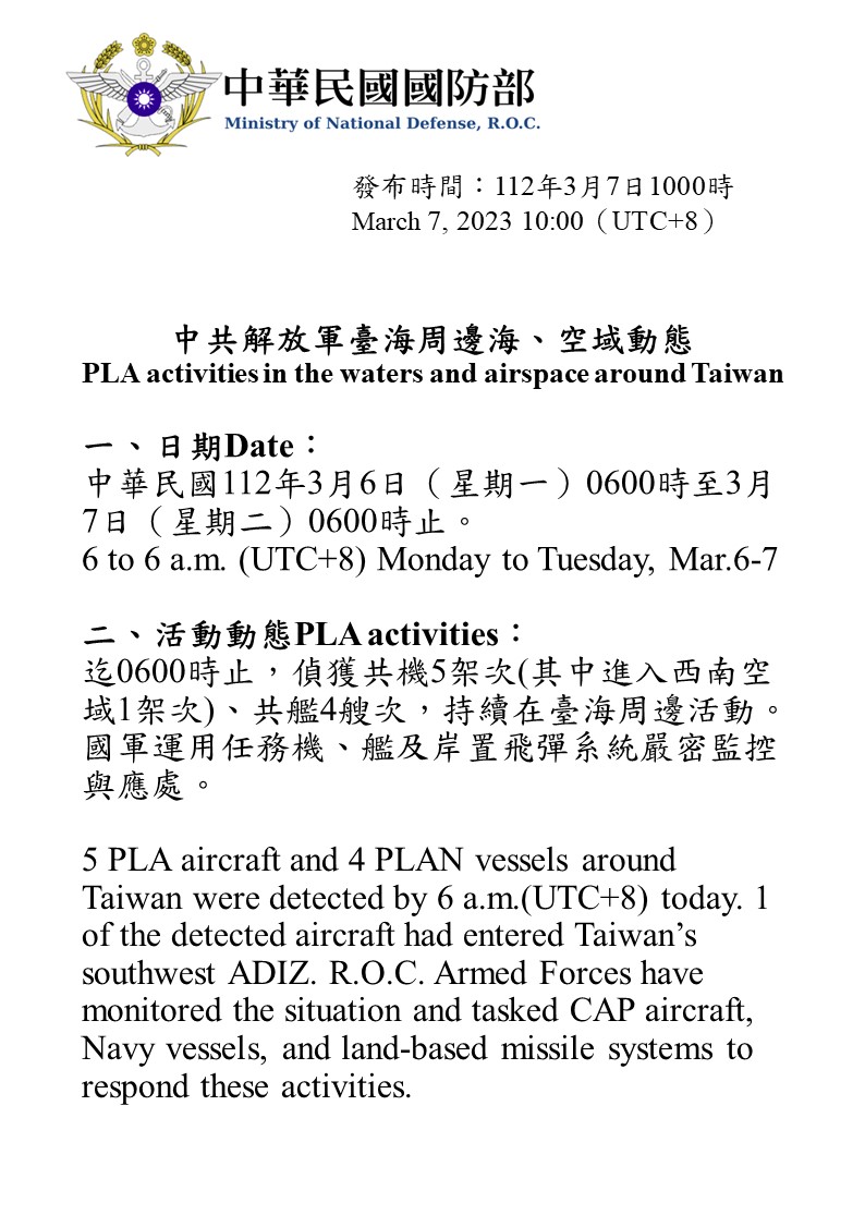 迄0600時止,偵獲共機5架次(其中進入西南空域1架次)、共艦4艘次,持續在臺海周邊活動。國軍運用任務機、艦及岸置飛彈系統嚴密監控與應處。