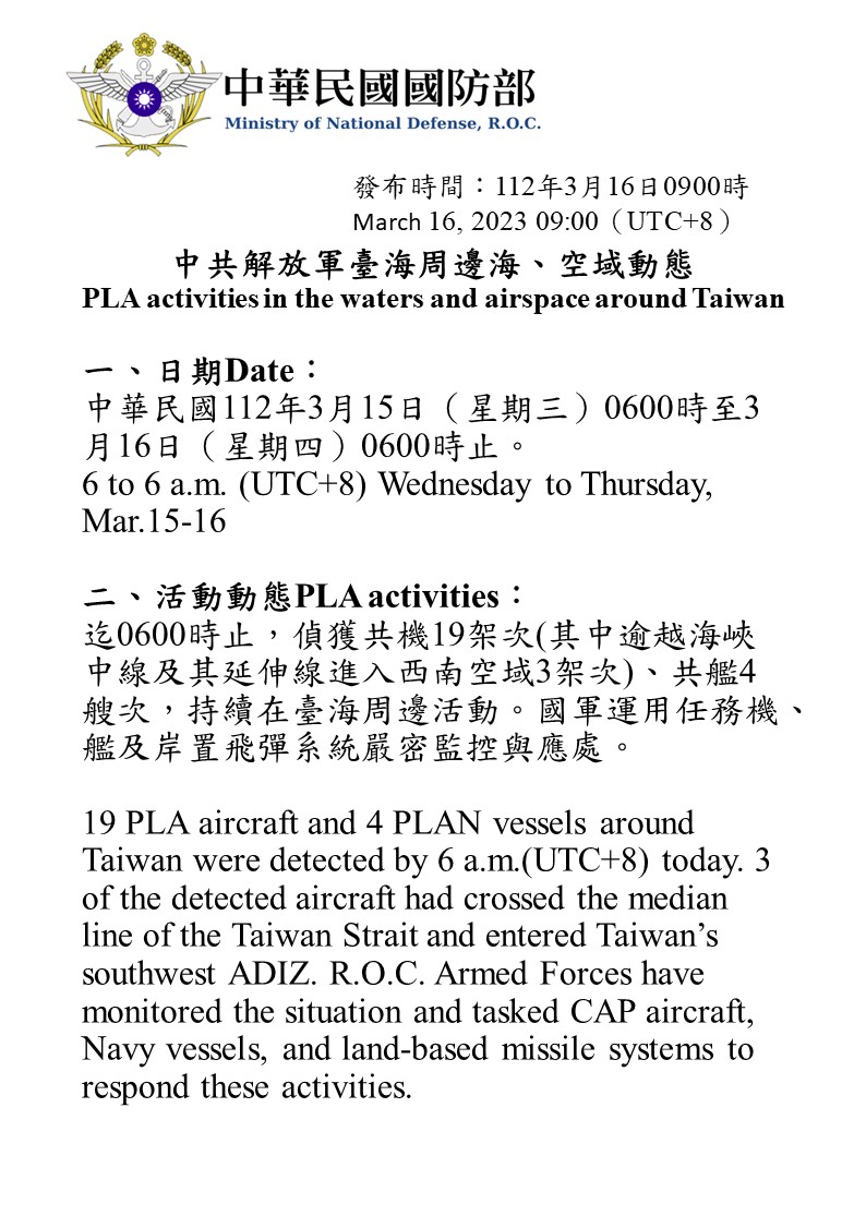 迄0600時止,偵獲共機19架次(其中逾越海峽中線及其延伸線進入西南空域3架次)、共艦4艘次,持續在臺海周邊活動。國軍運用任務機、艦及岸置飛彈系統嚴密監控與應處。