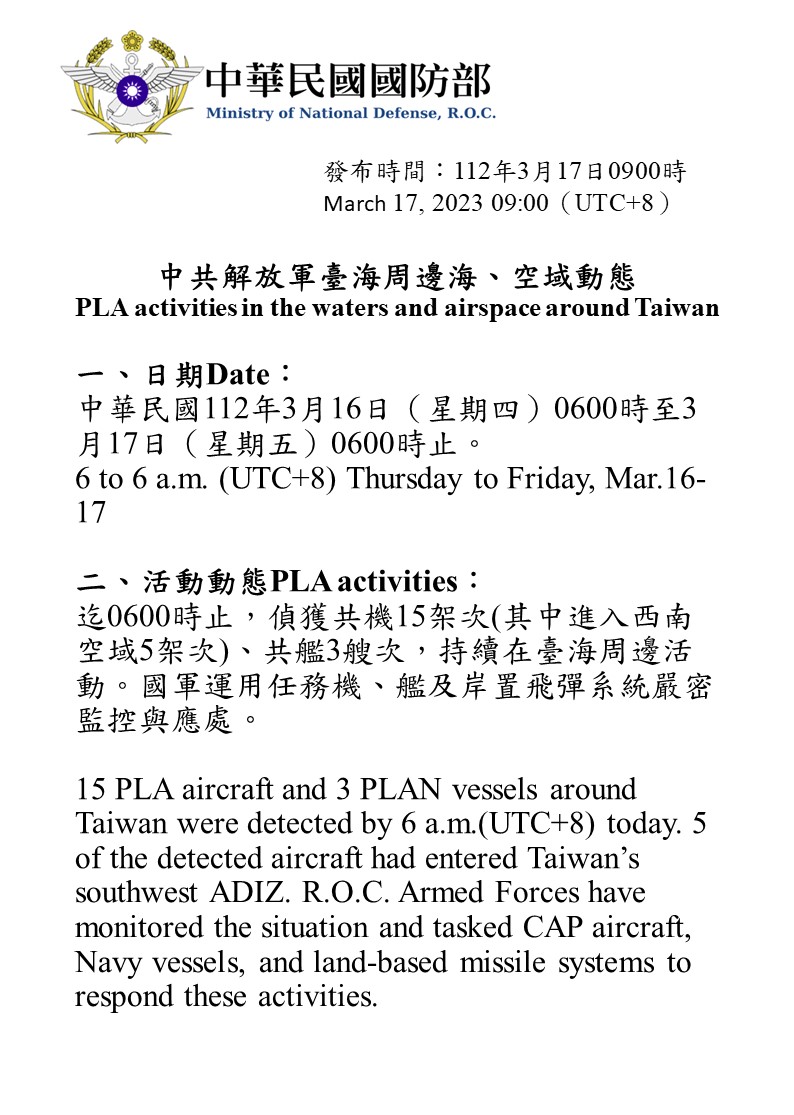 迄0600時止,偵獲共機15架次(其中進入西南空域5架次)、共艦3艘次,持續在臺海周邊活動。國軍運用任務機、艦及岸置飛彈系統嚴密監控與應處。