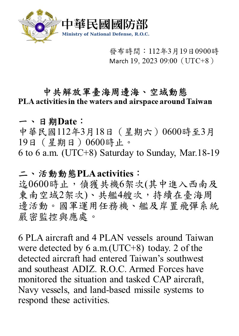 迄0600時止,偵獲共機6架次(其中進入西南及東南空域2架次)、共艦4艘次,持續在臺海周邊活動。國軍運用任務機、艦及岸置飛彈系統嚴密監控與應處。