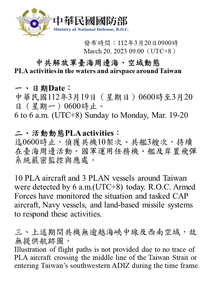 迄0600時止,偵獲共機10架次、共艦3艘次,持續在臺海周邊活動。國軍運用任務機、艦及岸置飛彈系統嚴密監控與應處。