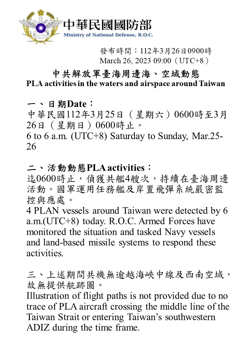 迄0600時止,偵獲共艦4艘次,持續在臺海周邊活動。國軍運用任務艦及岸置飛彈系統嚴密監控與應處。