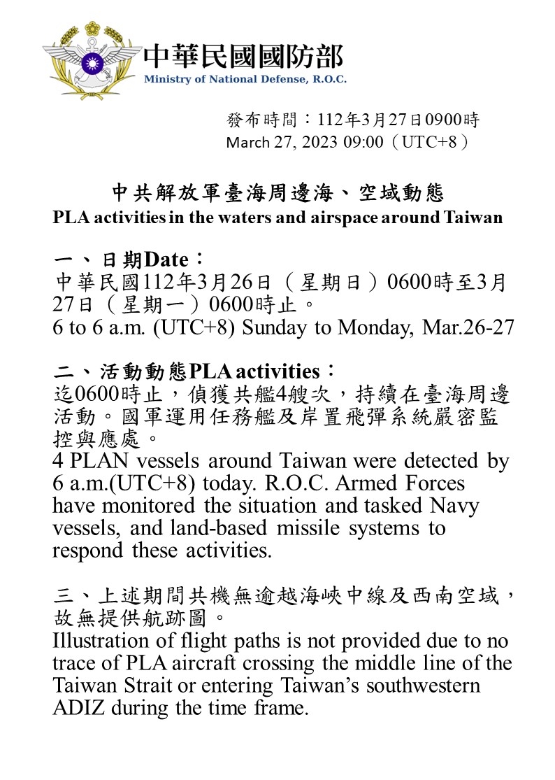 迄0600時止,偵獲共艦4艘次,持續在臺海周邊活動。國軍運用任務艦及岸置飛彈系統嚴密監控與應處。