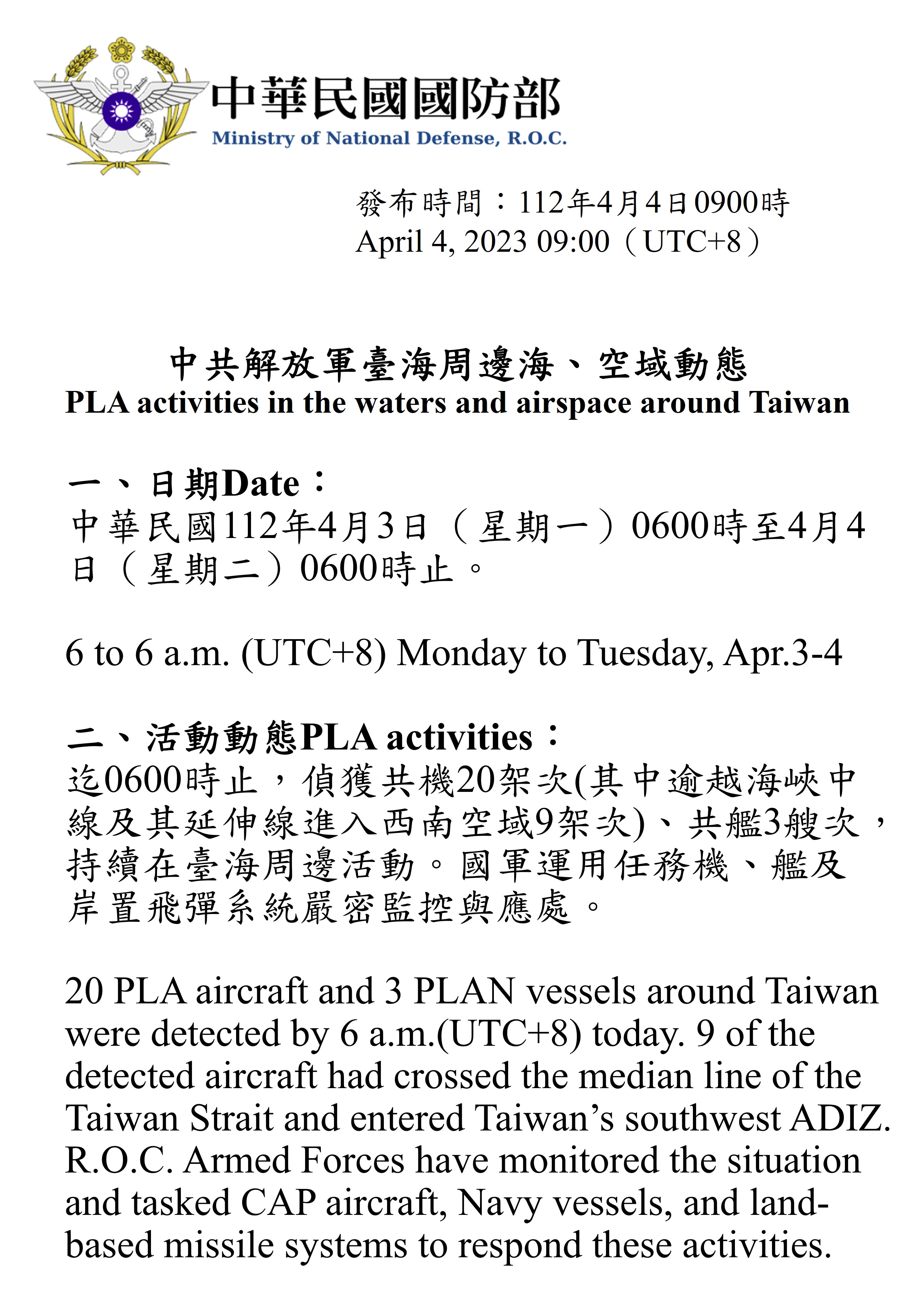 迄0600時止,偵獲共機20架次(其中逾越海峽中線及其延伸線進入西南空域9架次)、共艦3艘次,持續在臺海周邊活動。國軍運用任務機、艦及岸置飛彈系統嚴密監控與應處。