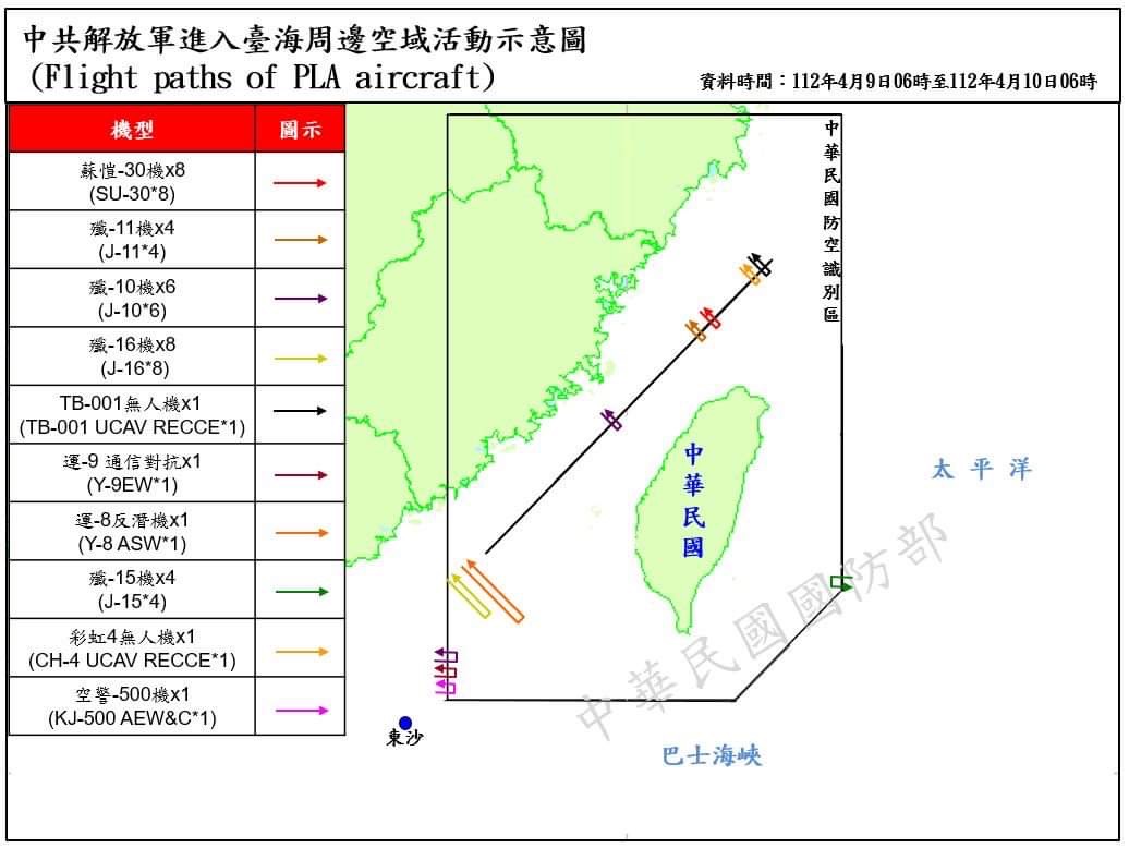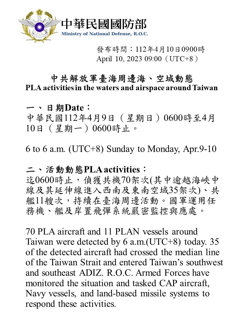 迄0600時止,偵獲共機70架次(其中逾越海峽中線及其延伸線進入西南及東南空域35架次)、共艦11艘次,持續在臺海周邊活動。國軍運用任務機、艦及岸置飛彈系統嚴密監控與應處。