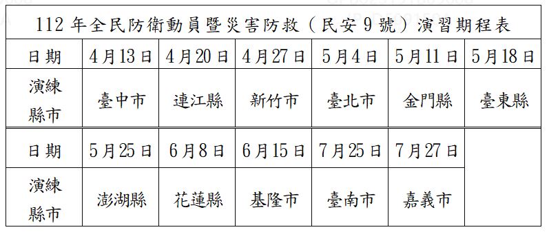 演習預於4至7月間由臺中市等3個直轄市及連江縣等8個縣(市)政府辦理,於4月13日起由臺中市政府辦理今年第1場次「民安9號演習」,各場次期程如下表:
