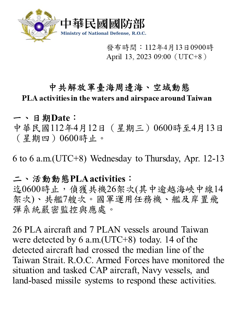 迄0600時止,偵獲共機26架次(其中逾越海峽中線14架次)、共艦7艘次。國軍運用任務機、艦及岸置飛彈系統嚴密監控與應處。