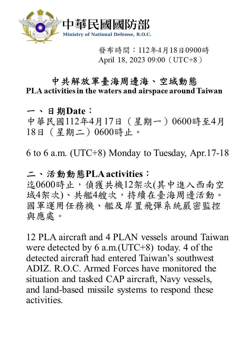 迄0600時止,偵獲共機12架次(其中進入西南空域4架次)、共艦4艘次。國軍運用任務機、艦及岸置飛彈系統嚴密監控與應處。