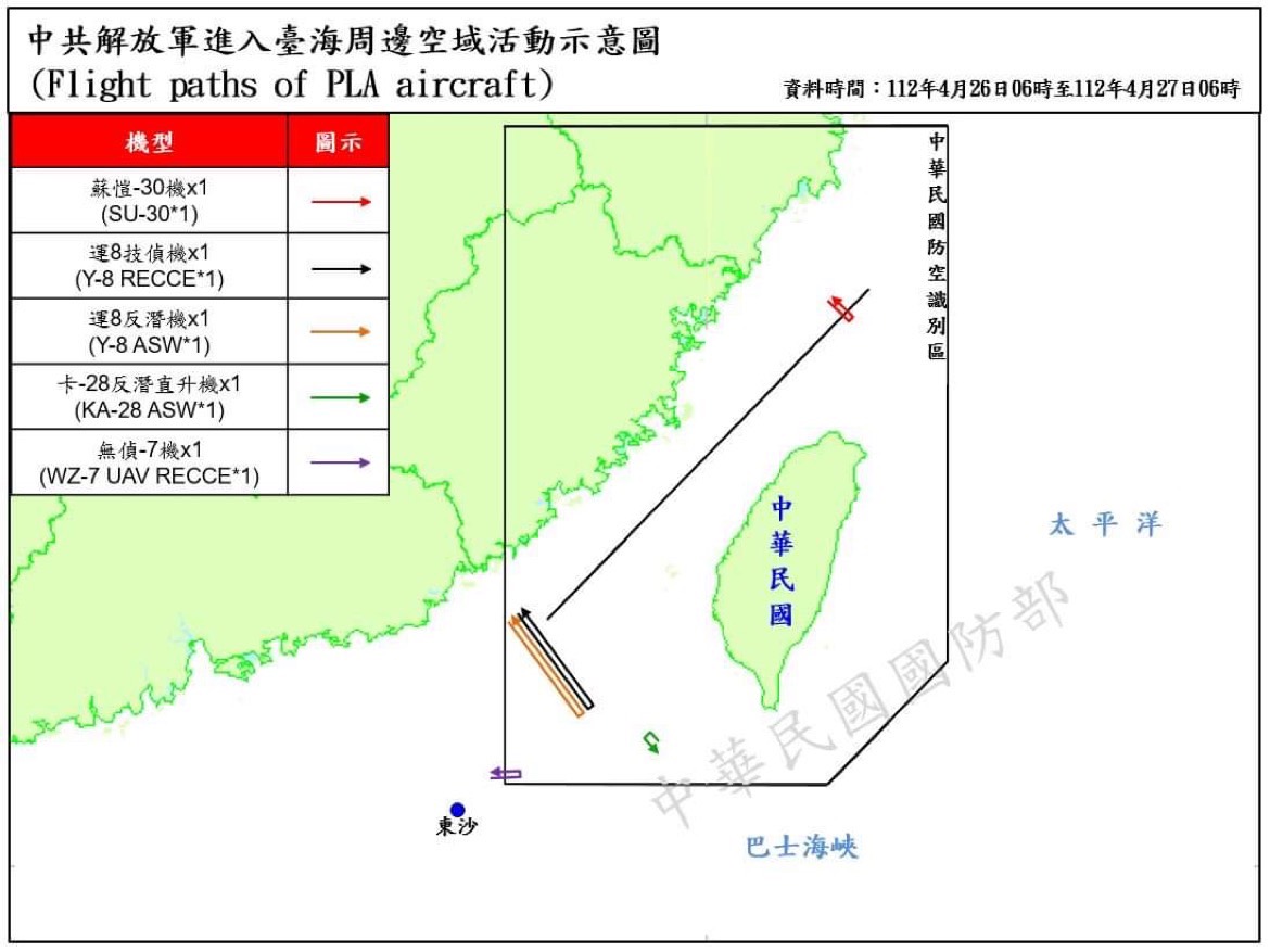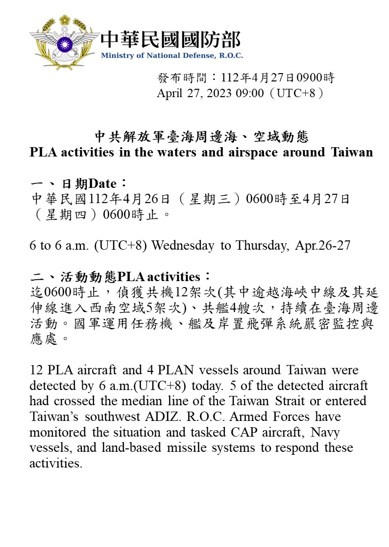 迄0600時止,偵獲共機12架次(其中逾越海峽中線及其延伸線進入西南空域5架次)、共艦4艘次,持續在臺海周邊活動。國軍運用任務機、艦及岸置飛彈系統嚴密監控與應處。