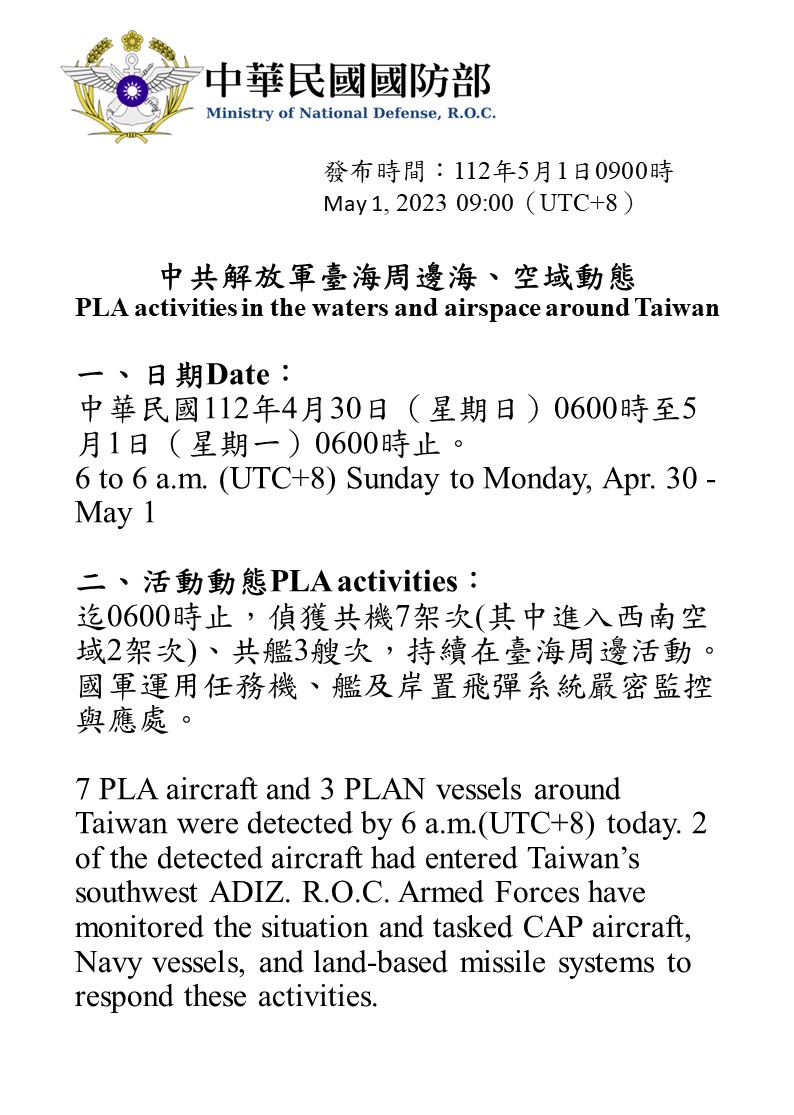迄0600時止,偵獲共機7架次(其中進入西南空域2架次)、共艦3艘次,持續在臺海周邊活動。國軍運用任務機、艦及岸置飛彈系統嚴密監控與應處。