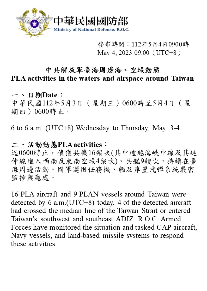 迄0600時止,偵獲共機16架次(其中逾越海峽中線及其延伸線進入西南及東南空域4架次)、共艦9艘次,持續在臺海周邊活動。國軍運用任務機、艦及岸置飛彈系統嚴密監控與應處。