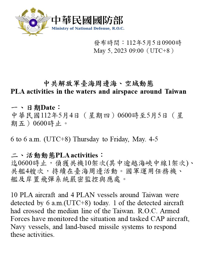 迄0600時止,偵獲共機10架次(其中逾越海峽中線1架次)、共艦4艘次,持續在臺海周邊活動。國軍運用任務機、艦及岸置飛彈系統嚴密監控與應處。
