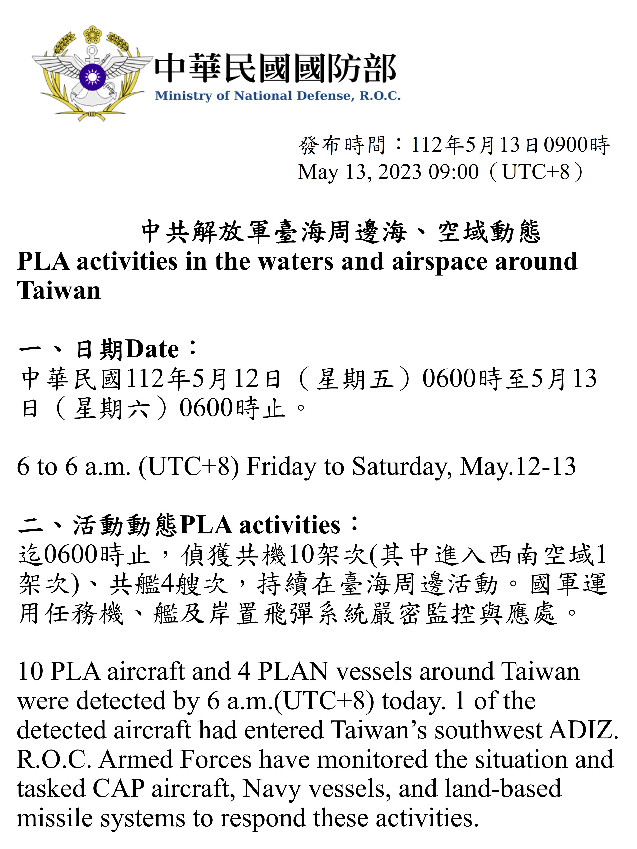 迄0600時止,偵獲共機10架次(其中進入西南空域1架次)、共艦4艘次,持續在臺海周邊活動。國軍運用任務機、艦及岸置飛彈系統嚴密監控與應處。