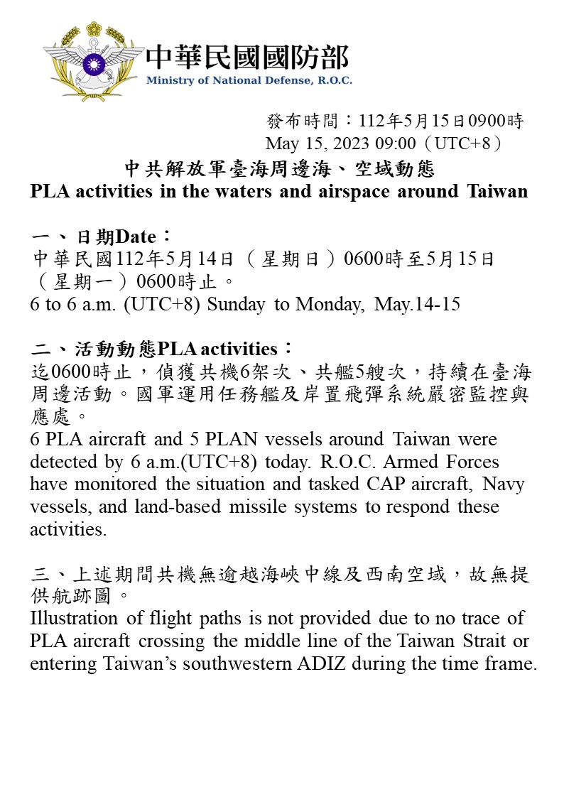 迄0600時止,偵獲共機6架次、共艦5艘次,持續在臺海周邊活動。國軍運用任務艦及岸置飛彈系統嚴密監控與應處。