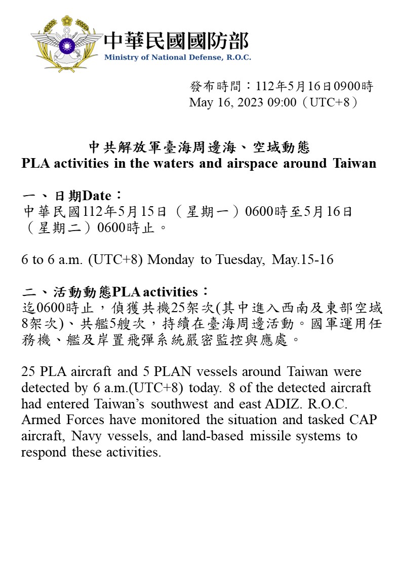 迄0600時止,偵獲共機25架次(其中進入西南及東部空域8架次)、共艦5艘次,持續在臺海周邊活動。國軍運用任務機、艦及岸置飛彈系統嚴密監控與應處。