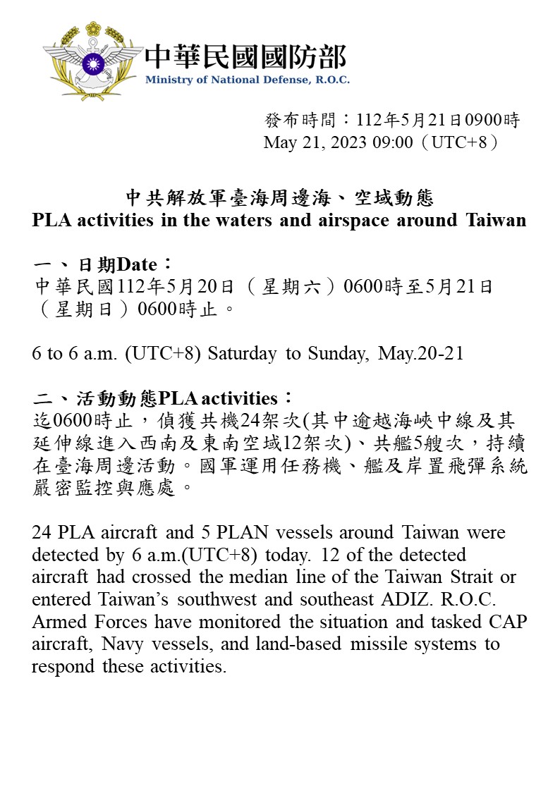 迄0600時止,偵獲共機24架次(其中逾越海峽中線及其延伸線進入西南及東南空域12架次)、共艦5艘次,持續在臺海周邊活動。國軍運用任務機、艦及岸置飛彈系統嚴密監控與應處。