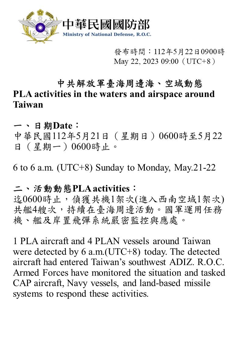 迄0600時止,偵獲共機1架次(進入西南空域1架次)、共艦4艘次,持續在臺海周邊活動。國軍運用任務機、艦及岸置飛彈系統嚴密監控與應處。