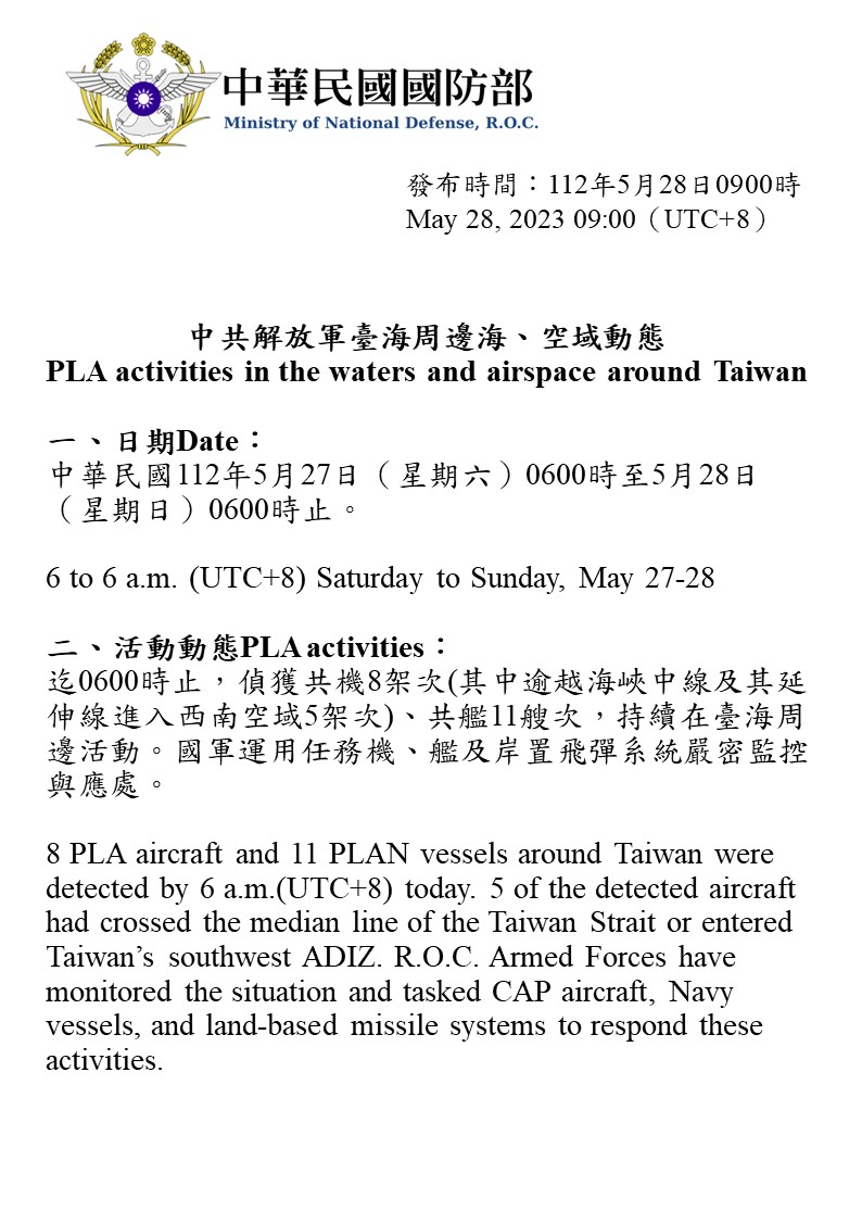 迄0600時止,偵獲共機8架次(其中逾越海峽中線及其延伸線進入西南空域5架次)、共艦11艘次,持續在臺海周邊活動。國軍運用任務機、艦及岸置飛彈系統嚴密監控與應處。