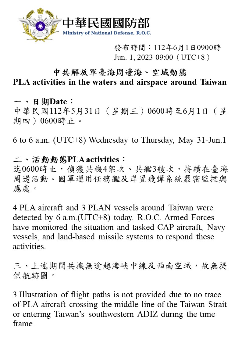 迄0600時止,偵獲共機4架次、共艦3艘次,持續在臺海周邊活動。國軍運用任務艦及岸置飛彈系統嚴密監控與應處。