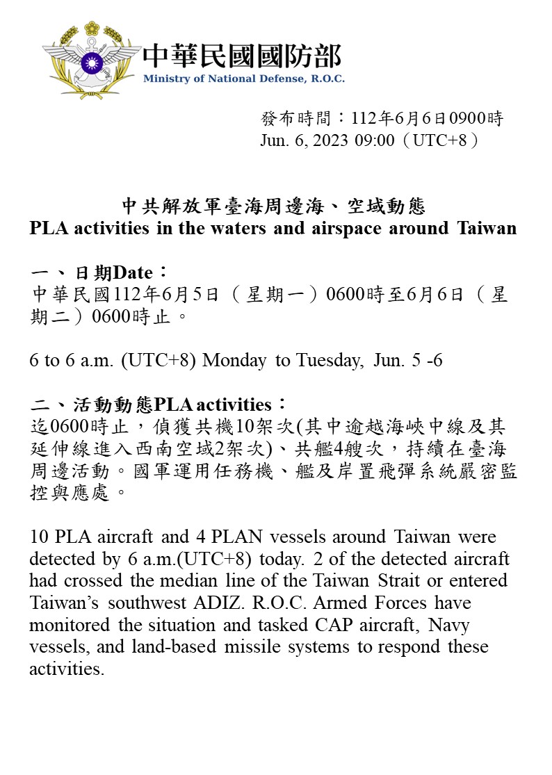 迄0600時止,偵獲共機10架次(其中逾越海峽中線及其延伸線進入西南空域2架次)、共艦4艘次,持續在臺海周邊活動。國軍運用任務機、艦及岸置飛彈系統嚴密監控與應處。