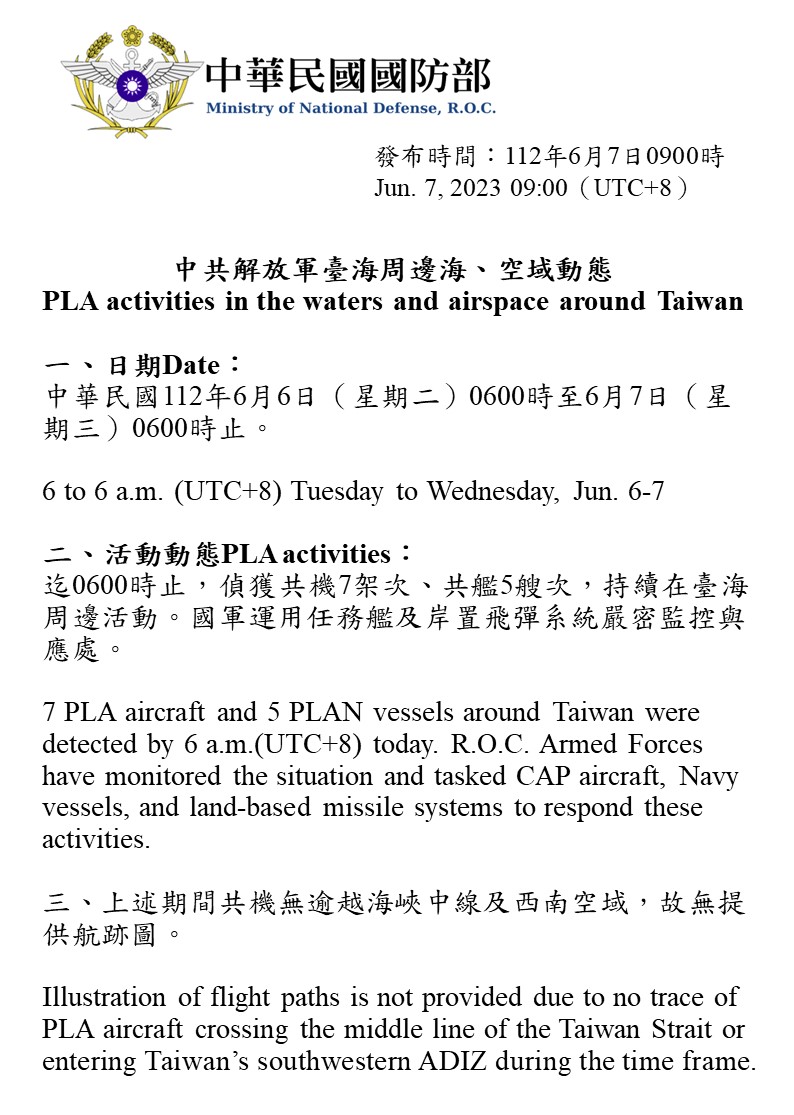 迄0600時止,偵獲共機7架次、共艦5艘次,持續在臺海周邊活動。國軍運用任務艦及岸置飛彈系統嚴密監控與應處。